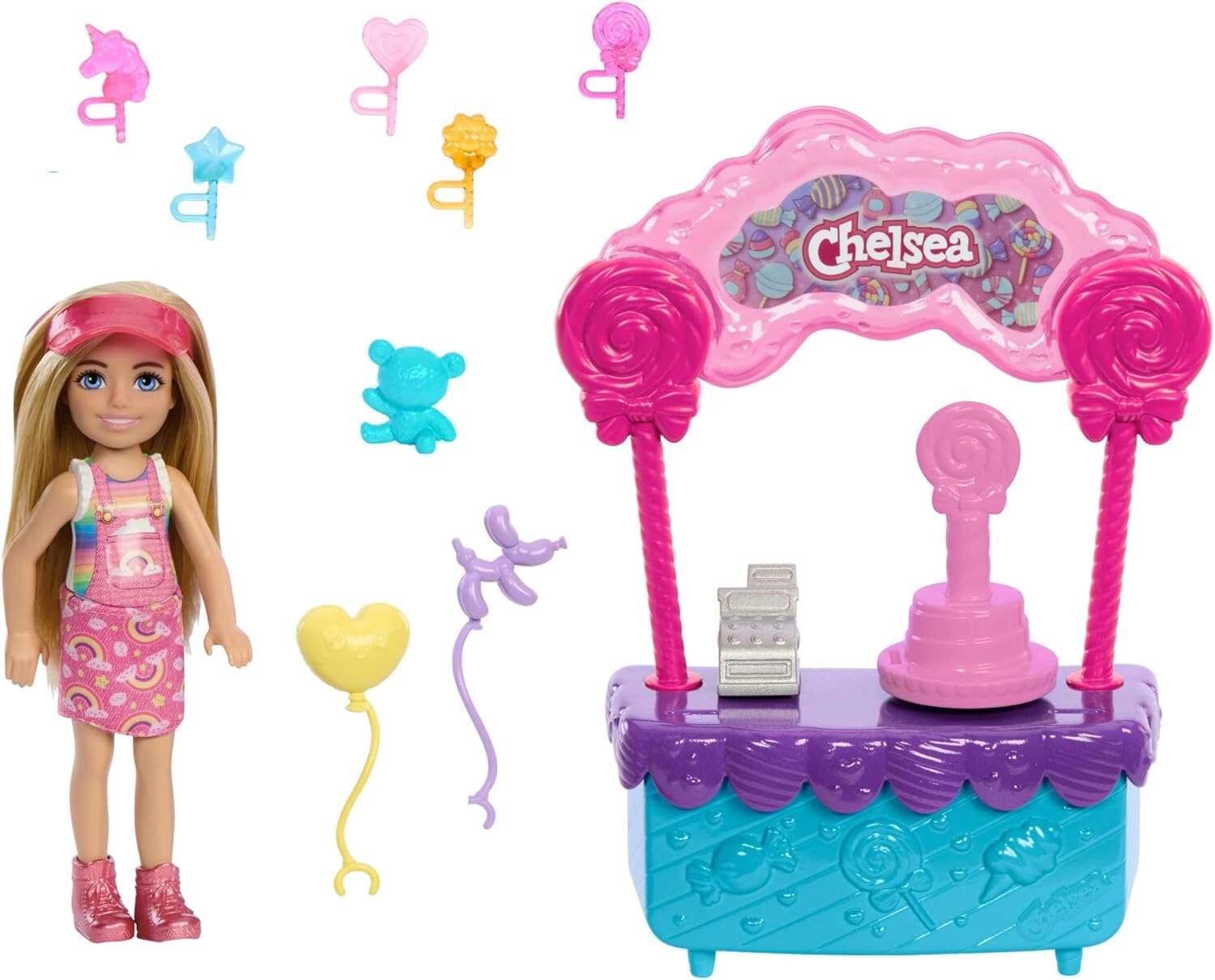 Stánok je plný farebných detailov: ružové stĺpiky s lízankami, pokladňa, výstavná plocha a otočný stojan na tortu. Bábika Chelsea nosí ružové šaty s motívom dúhy a štýlovú šiltovku, má pohyblivé paže a dokáže „držať“ vybrané doplnky. Vďaka kompaktným rozmerom je set skvelý doma aj na cesty.