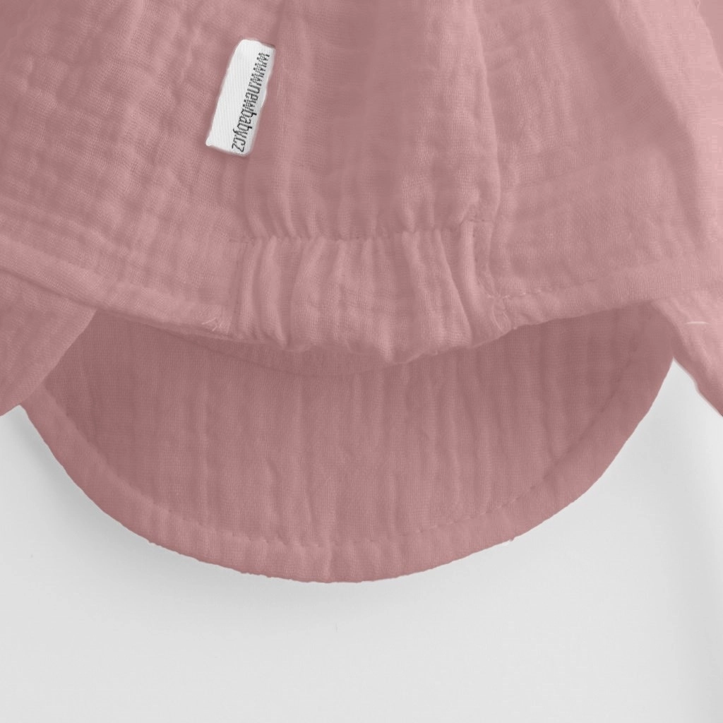 Mušelín patrí medzi najj emnejšie a najčistejšie tkaniny. Je mimoriadne odolný, ľahko sa udržiava a opakované pranie zvyšuje jeho hebkosť. Viazanie na šnúrky zaručí, že čiapočka pevne drží na hlavičke bez nepríjemného tlačenia.