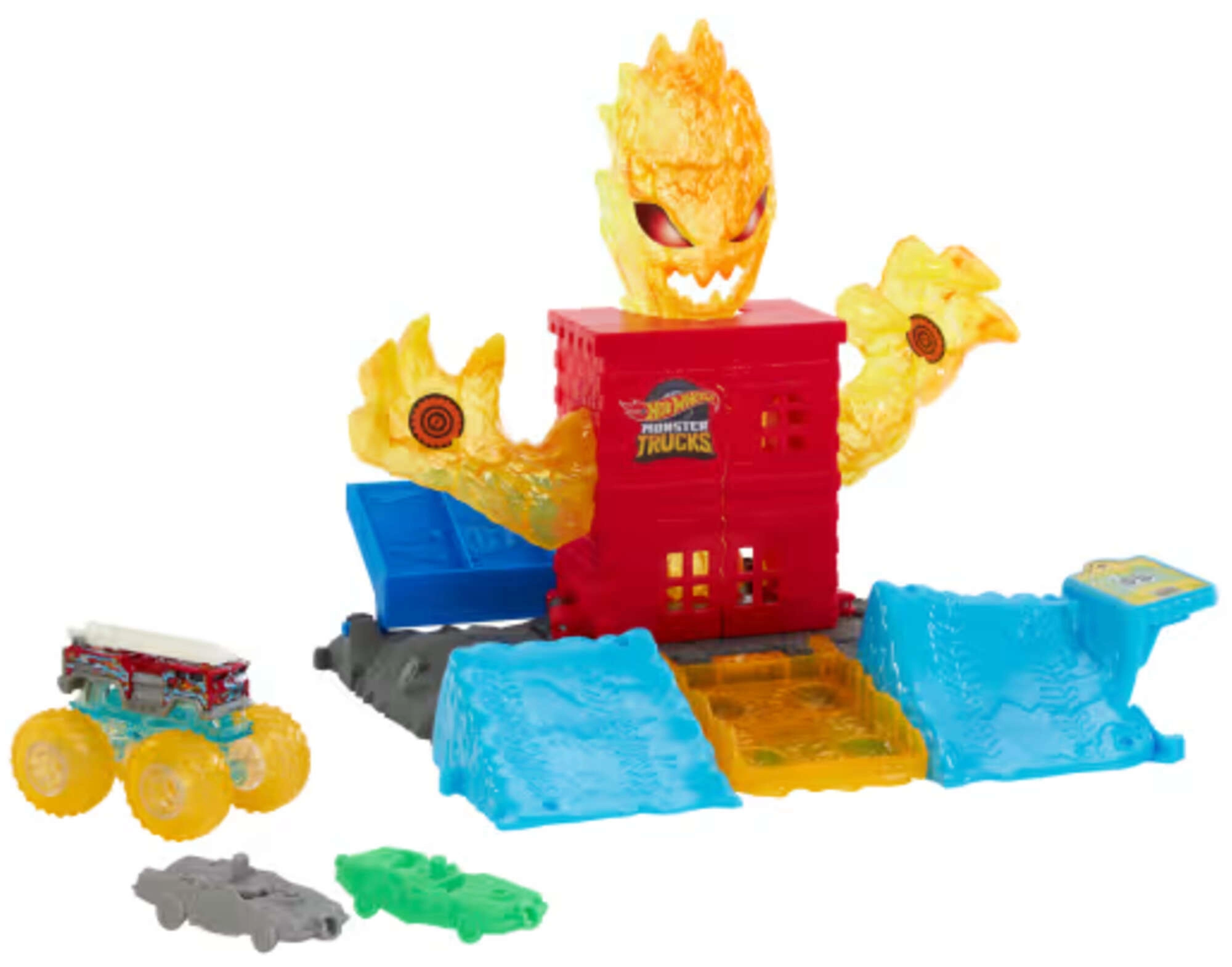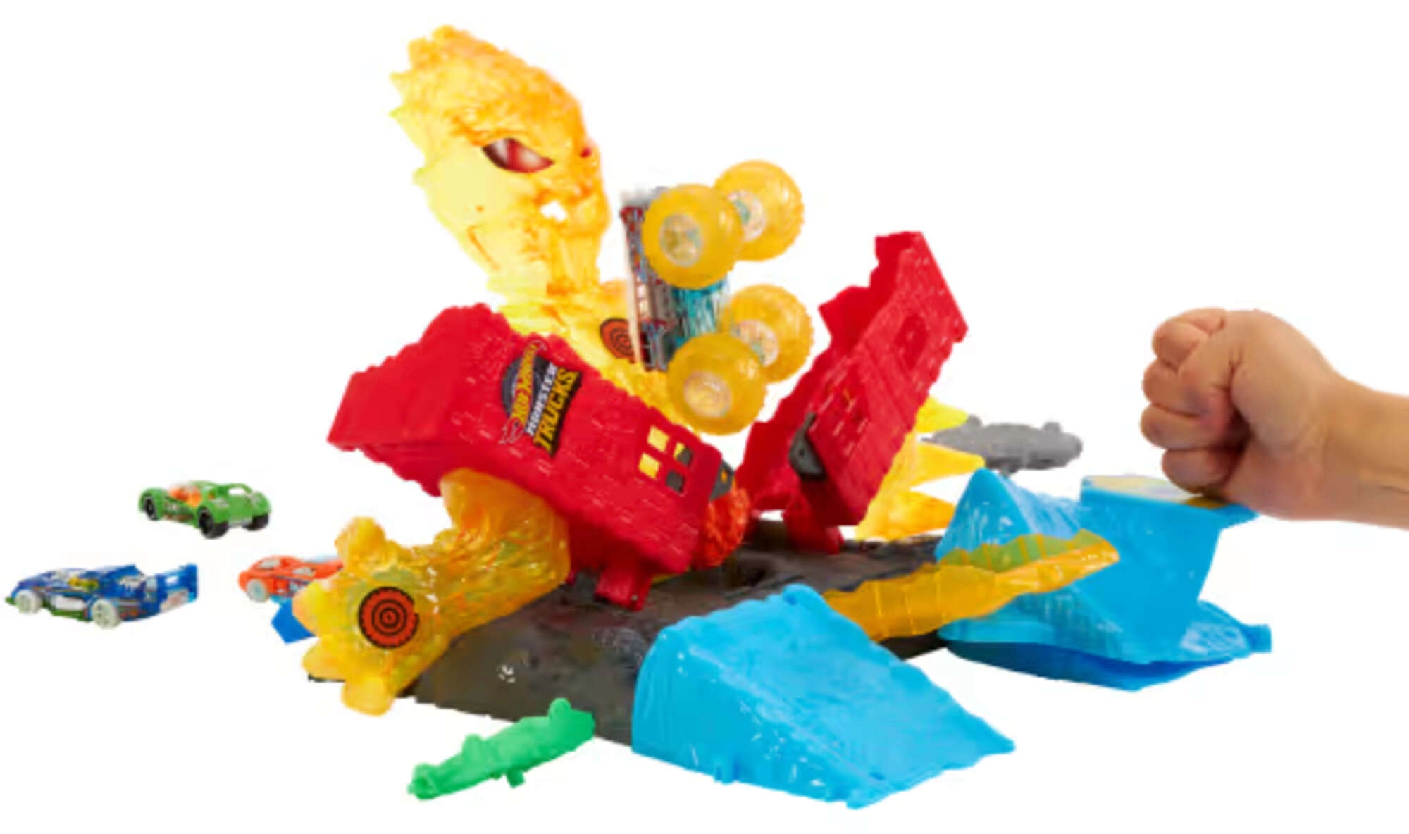 Ovládnite arénu s centrálnou ohnivou vežou, pružinovým odpaľovačom a interaktívnymi prekážkami. Každý presný zásah spustí efektný výbuch, zhupnutie brán či pád dielov – dokonalé na tréning presnosti aj súťažnú hru s kamarátmi. Ideálny darček pre fanúšikov HOT WHEELS a monster truckov.