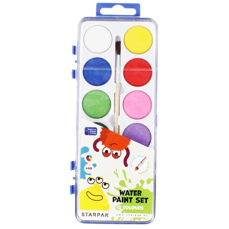 Táto sada vodových farieb ponúka všetko potrebné na rýchle a pohodlné maľovanie – v balení nájdete 12 kusov farieb a kvalitný štetec. Kompaktné rozmery uľahčujú prenášanie do školy aj na cesty, vďaka čomu je sada skvelou voľbou pre kreatívne deti aj začínajúcich umelcov.
