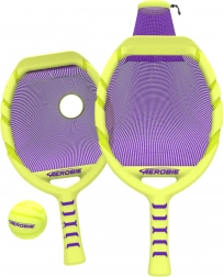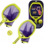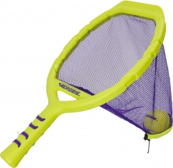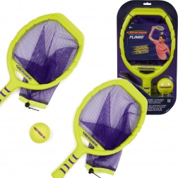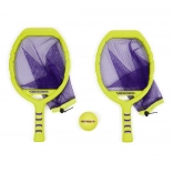 Dve rakety v neónovo žltej farbe s fialovou sieťkou a zodpovedajúcou loptičkou vytvárajú výrazný, ľahko viditeľný set pre aktívne rodinné chvíle, priateľské duely aj tréning obratnosti a koordinácie. Zábava bez prestávok: sieťka pomôže loptičku ľahko zdvihnúť zo zeme a pokračovať v hre.