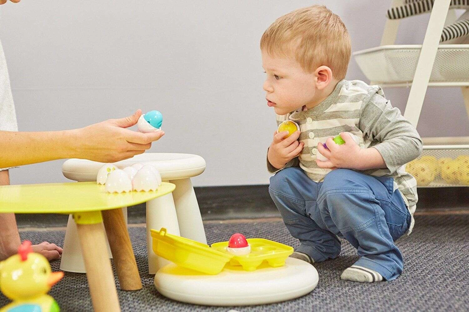 Farebné kuriatka vo vajíčkach po stlačení pískajú. Dieťa tak prirodzene rozvíja sluch, hmat a vnímanie príčiny a následku.