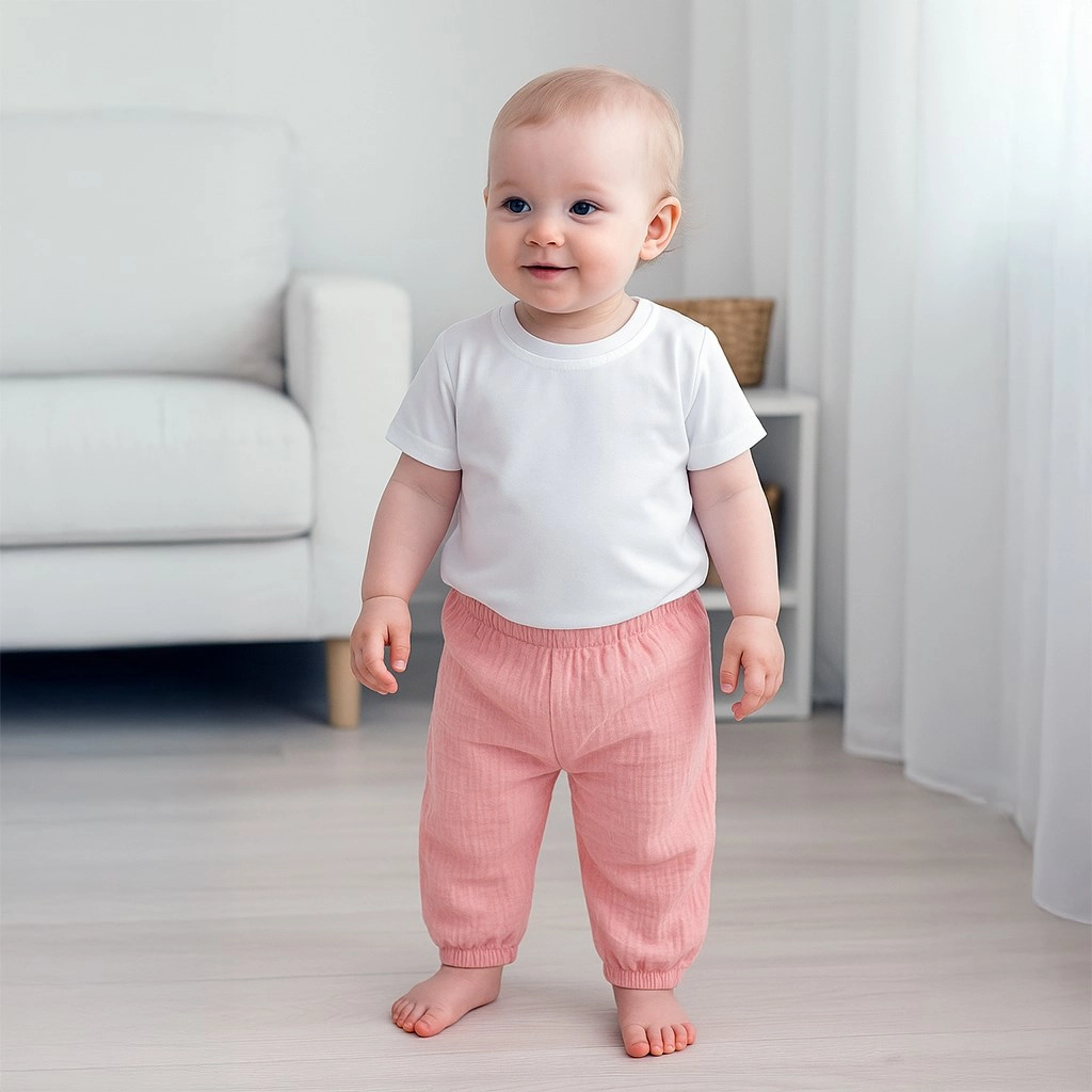 Táto detská súprava NEW BABY KINDERGARTEN v ružovej farbe je skvelou voľbou na každodenné nosenie. Kombinuje mäkké bavlnené tričko bez zapínania s jemným lemom pri krku a jednofarebné mušelínové nohavice s moderným vzhľadom. Vďaka ľahkému a priedušnému materiálu sa deti budú cítiť pohodlne po celý deň.