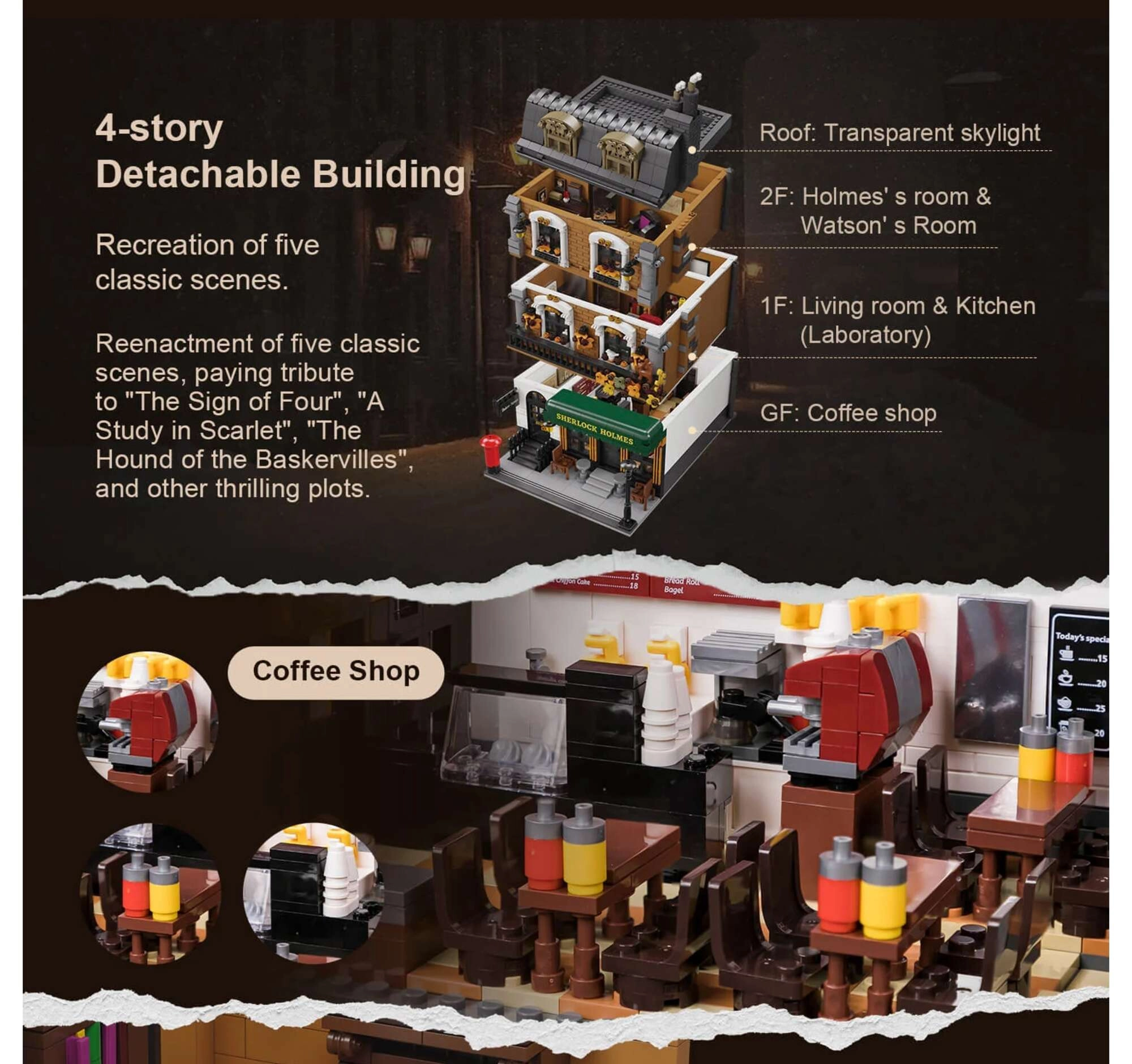 Model štvorpodlažného mestského domu verne zachytáva atmosféru viktoriánskeho Londýna. Nájdete v ňom útulný salón s knižnicami, kaviarenský bar 221B, Holmesovu spálňu s novinami a violončelom aj pracovňu plnú artefaktov. Vďaka viac než 60 špeciálne tlačeným kockám s motívmi Londýna, Watsona a máp si užijete maximálnu autentickosť bez potreby nálepiek.