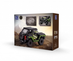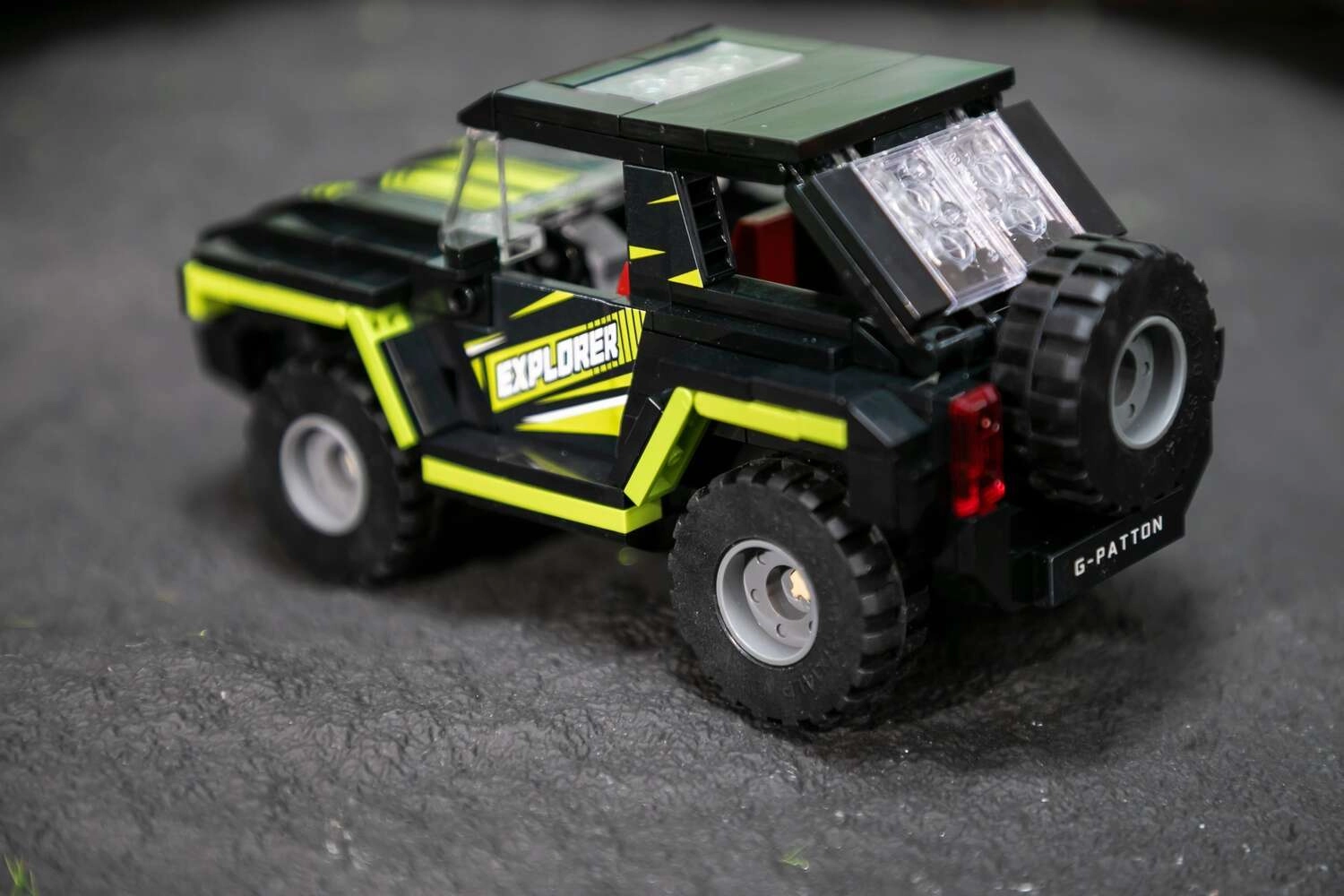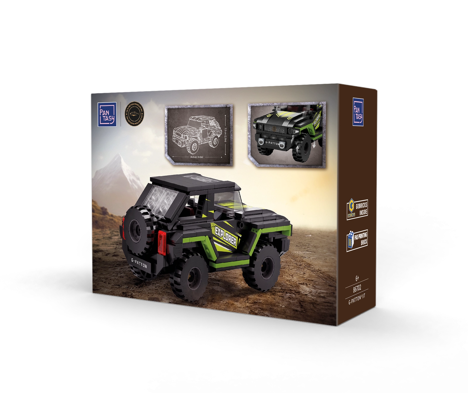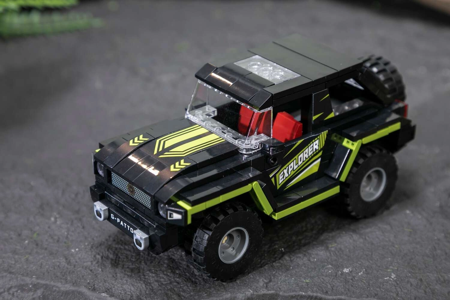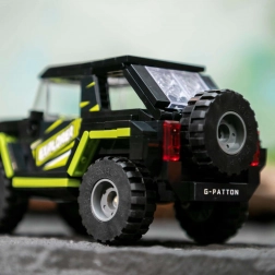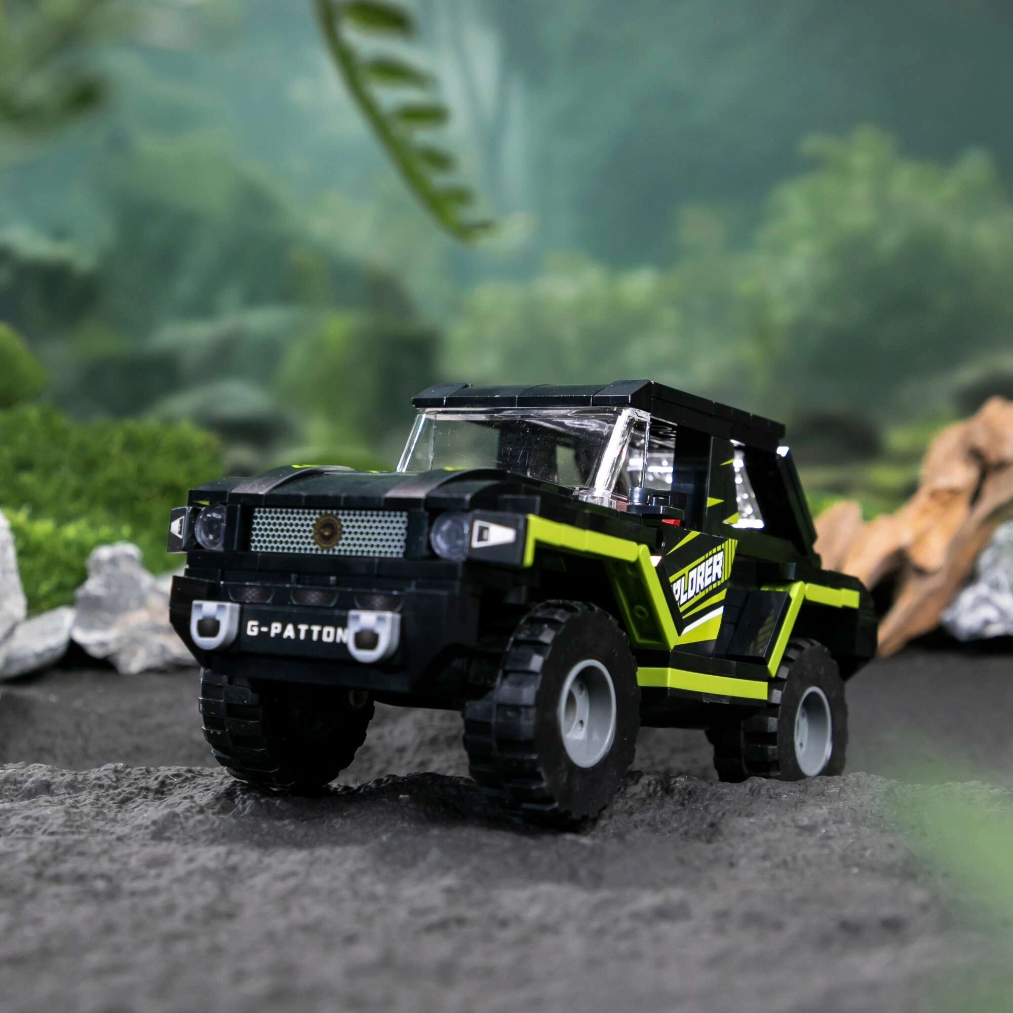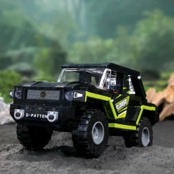 Tento štýlový off-road model v čierno–limetkovej kombinácii poteší realistickými detailmi: mohutnými pneumatikami, čírymi „oknami“, rezervným kolesom vzadu a potlačami EXPLORER/G–PATTON. Vďaka presne lícujúcim dielikom z ABS plastu je stavba príjemná a výsledok stabilný a odolný.