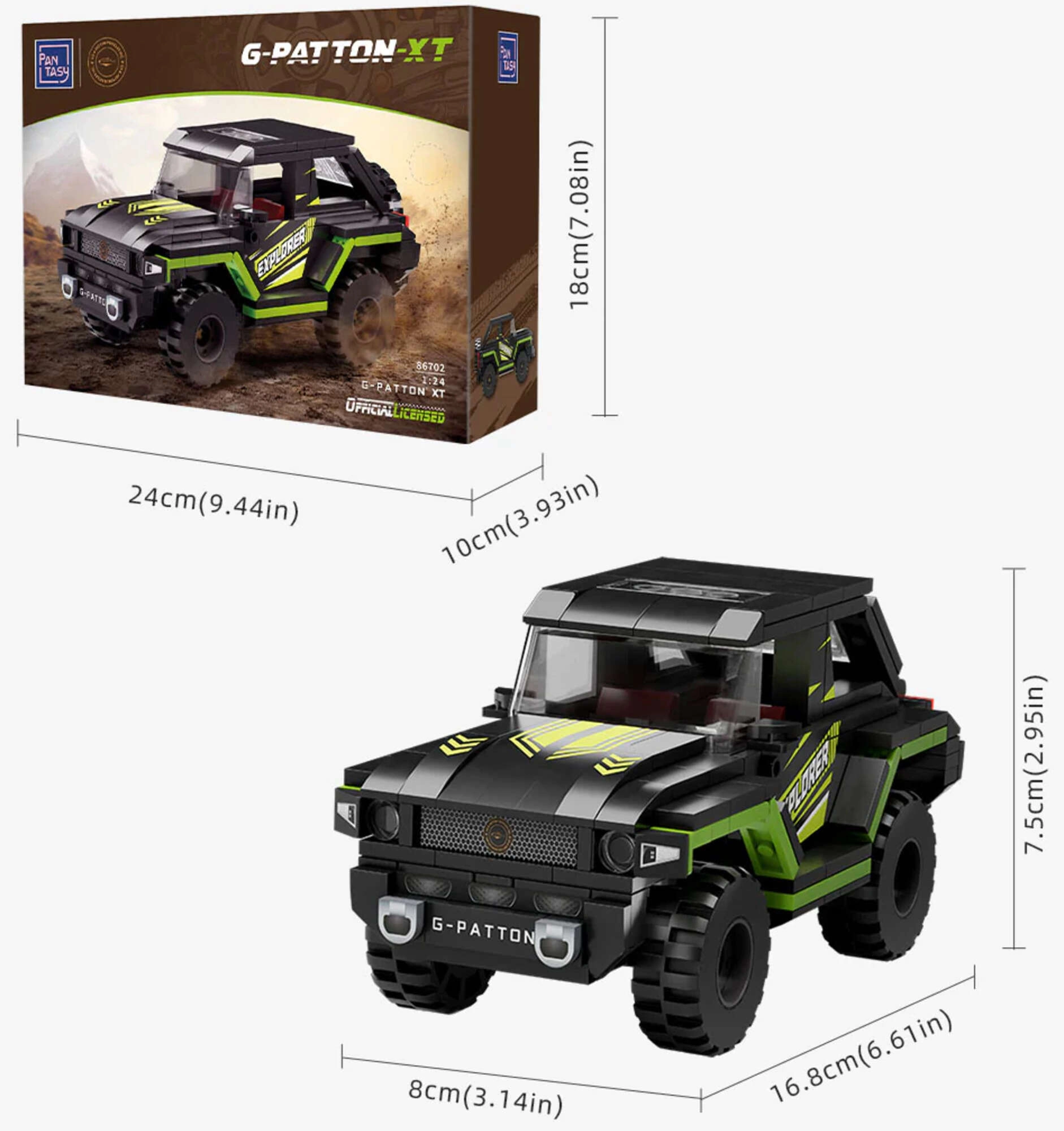 Objavte zberateľskú stavebnicu PANTASY G-Patton XT v mierke 1:24 s 323 dielikmi. Robustný terénny model s dĺžkou 16,8 cm ponúka detailnú potlač namiesto nálepiek, plynulé rolovanie kolies a kvalitný ABS plast pre dlhú životnosť. Skvelá voľba pre deti od 6+ aj dospelých fanúšikov stavebníc a off-road áut.