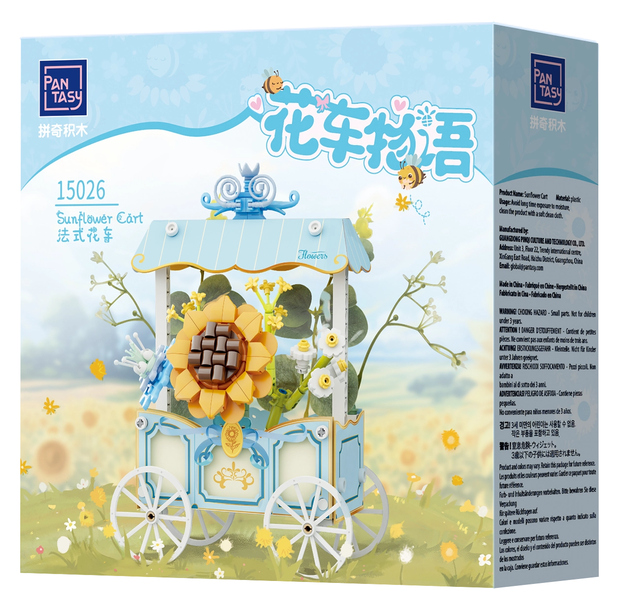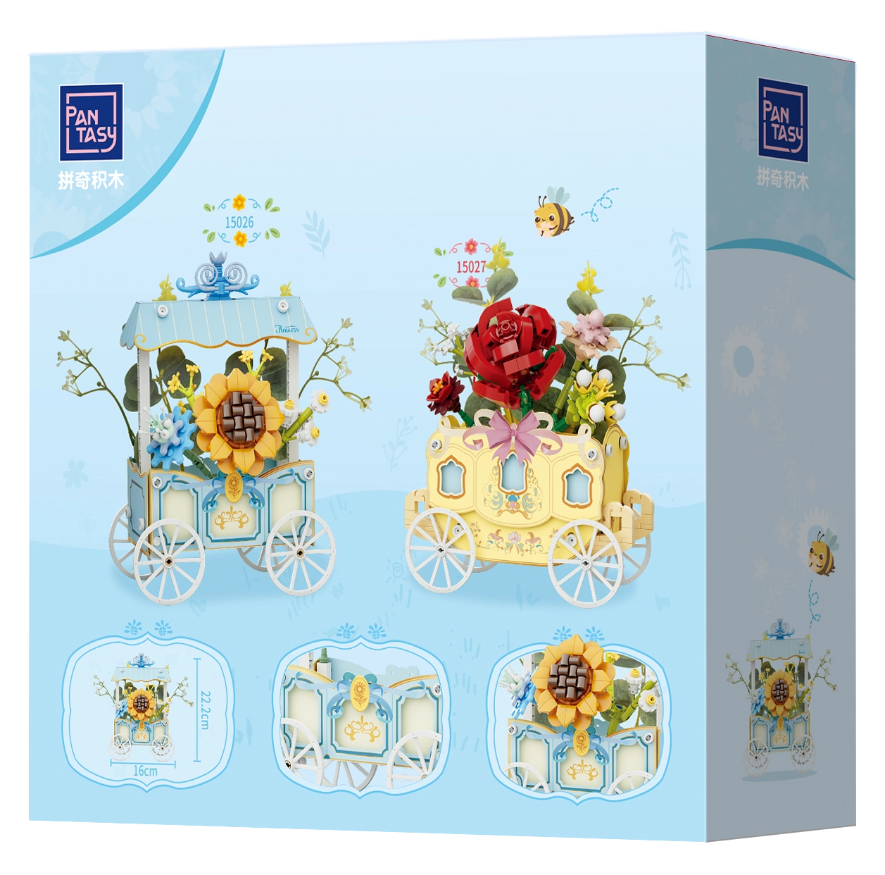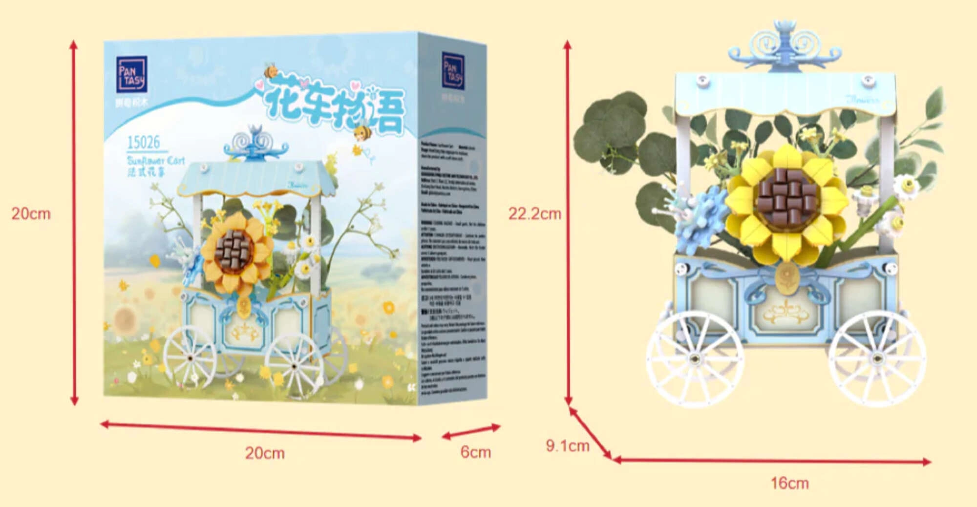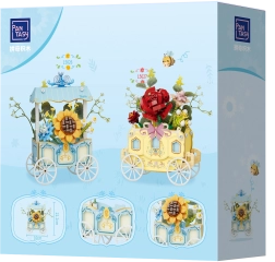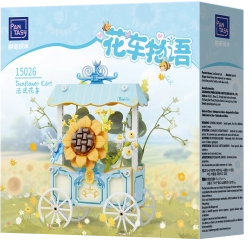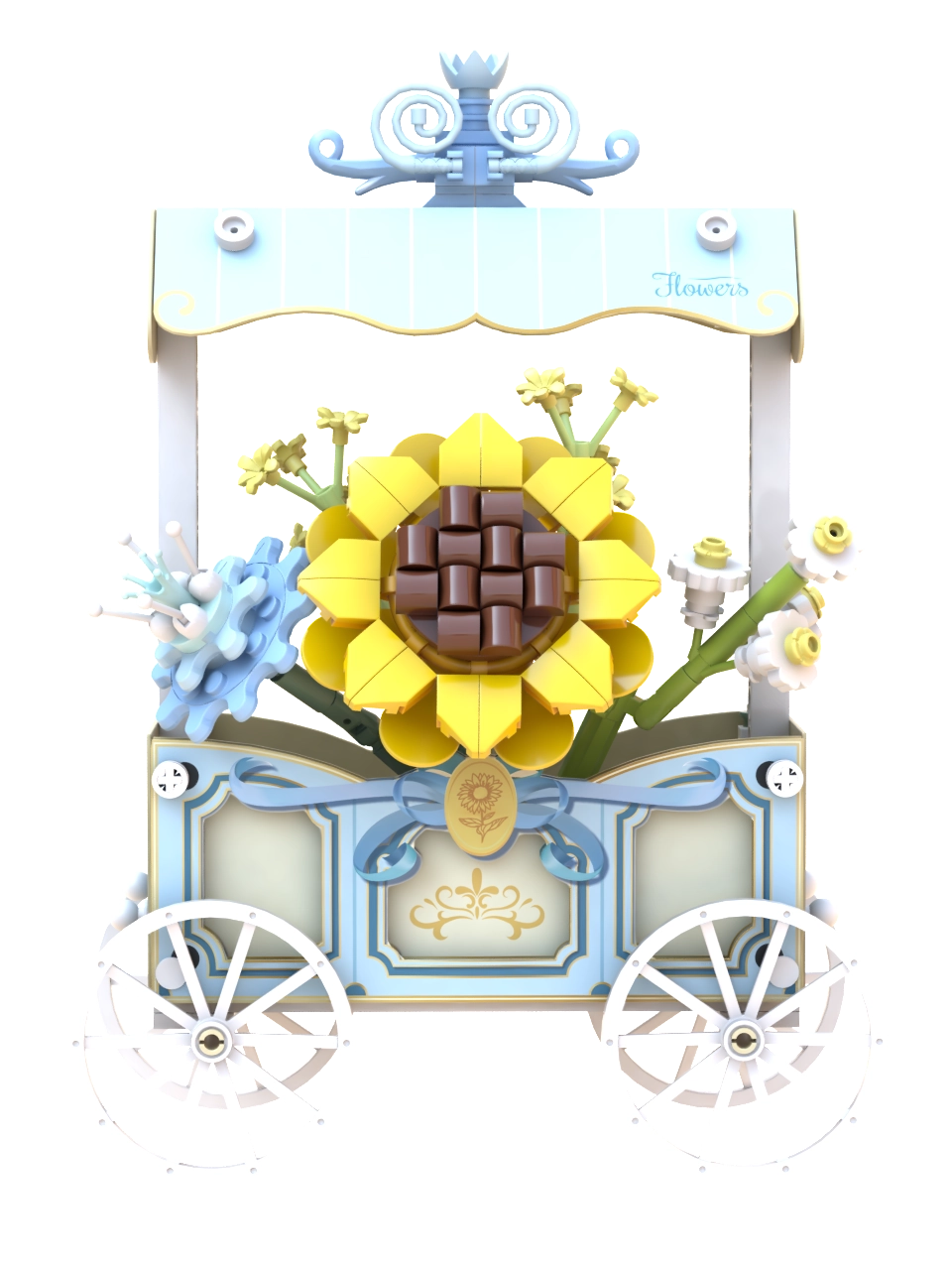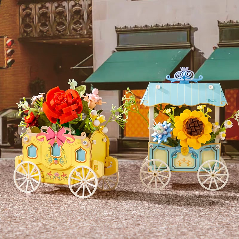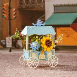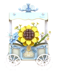 Tento rafinovaný model kombinuje kreatívne stavanie a dekoratívny dizajn. Vozík so štyrmi lúčovými kolesami zdobí pruhovaná strieška, jemné ornamenty a výrazná slnečnica doplnená ďalšími kvetmi. Všetky motívy sú potlačené priamo na dielikoch, takže zostávajú dlhodobo krásne.