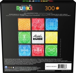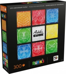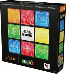 Obsah a motív: Po zložení získate štvorcový obraz 50,8 × 50,8 cm s deviatimi poľami odkazujúcimi na klasické usporiadanie 3×3. Stred kompozície zdobí logo RUBIK’S CUBE, okolie tvoria technické výkresy mechaniky slávnej kocky.