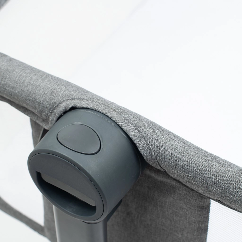 Sieťované steny zabezpečujú ventiláciu a prehľad o bábätku, oceľový rám dodáva konštrukcii stabilitu a bezpečnosť.