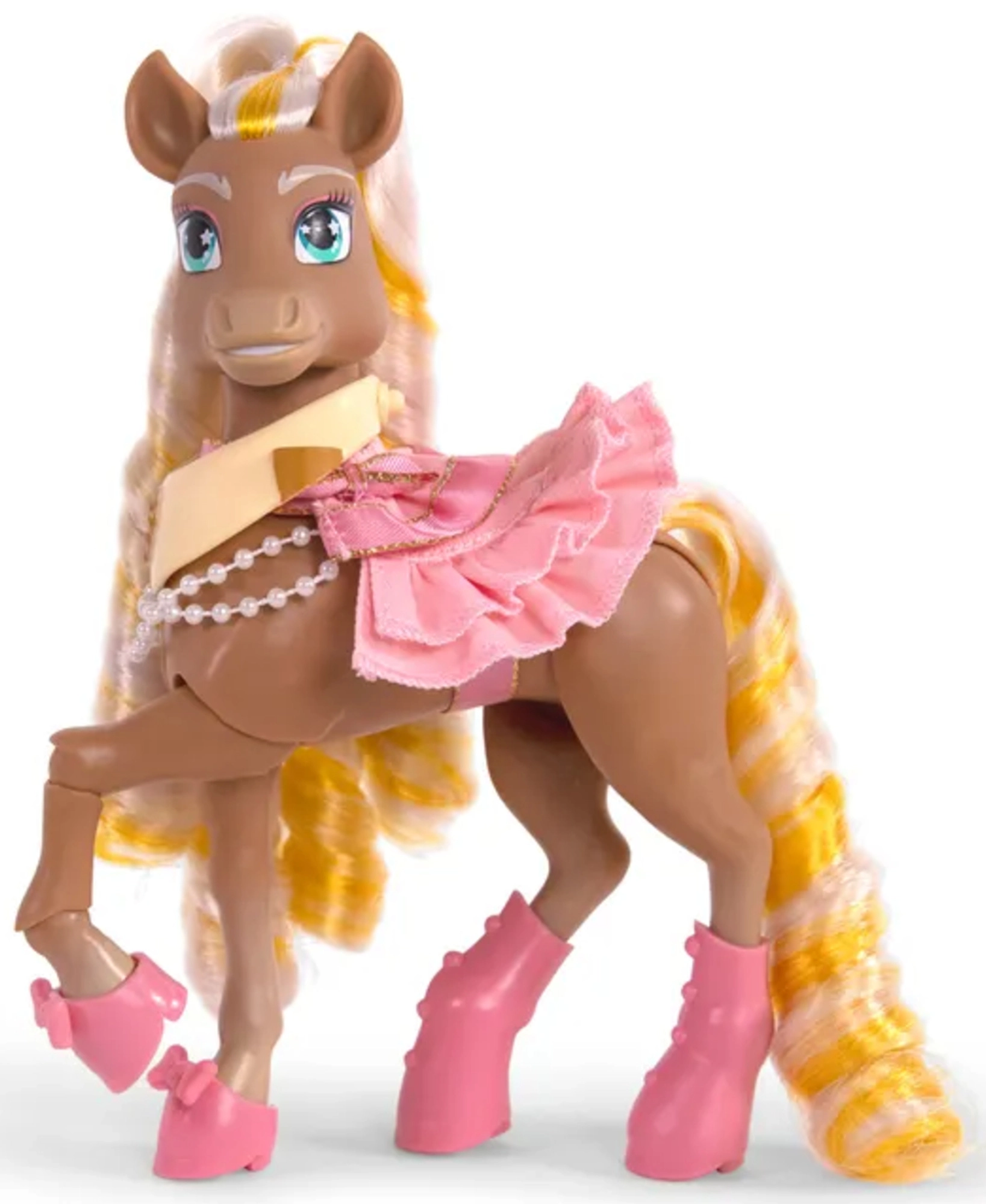 Poník s pohyblivými končatinami, dlhou hrivou so zlatými pramienkami a možnosťou držať doplnky vďaka klipsom v tvare podkovy.