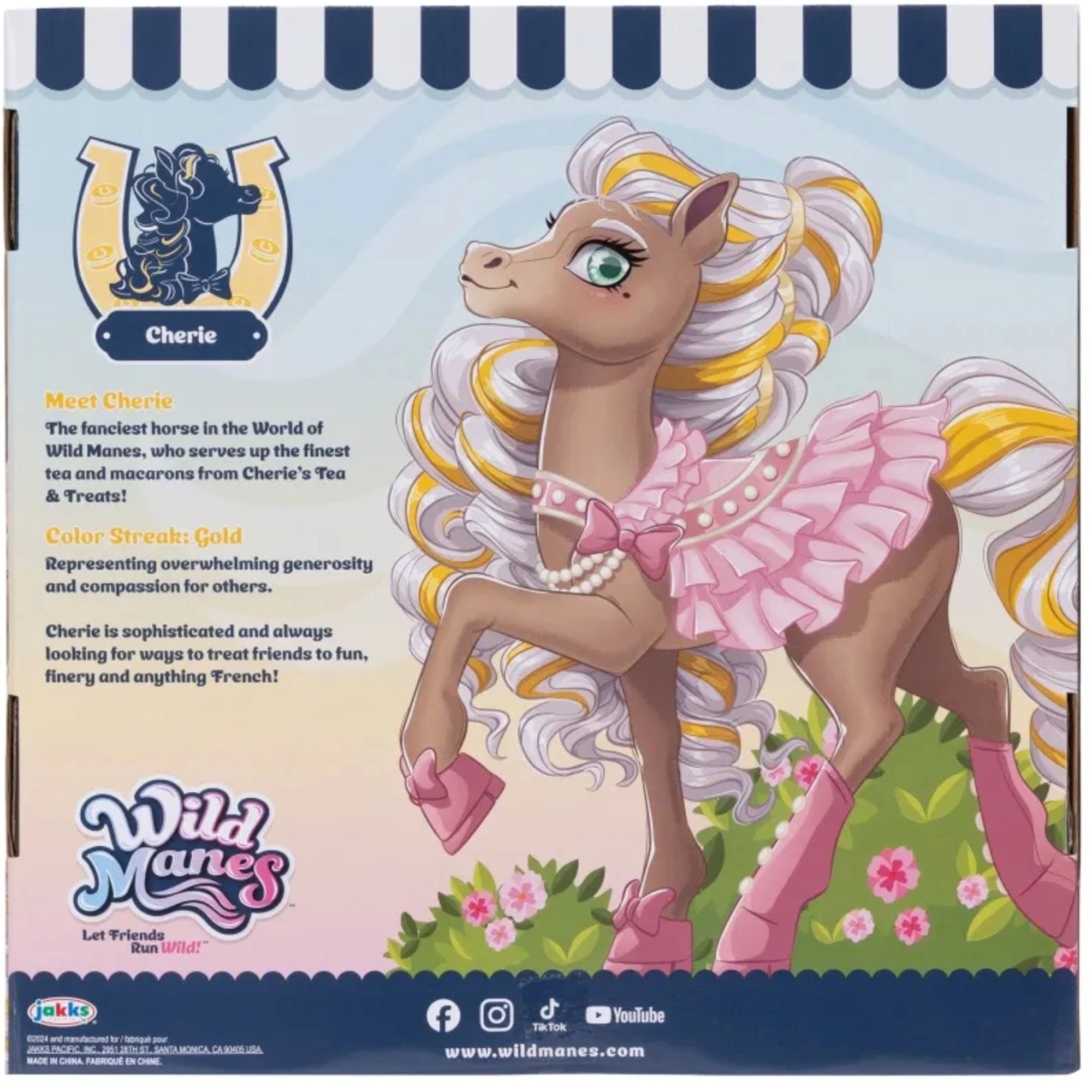 Figúrka Cherie v ružovej sukničke a topánočkách je pripravená rozbehnúť čajovú párty. Vďaka pohyblivým nohám ju ľahko nastavíte do rôznych póz a znovu vytvoríte obľúbené scény zo sveta WILD MANES. Dlhá, zvlnená hriva a chvost so zlatými prúžkami priamo lákajú na česanie a styling.