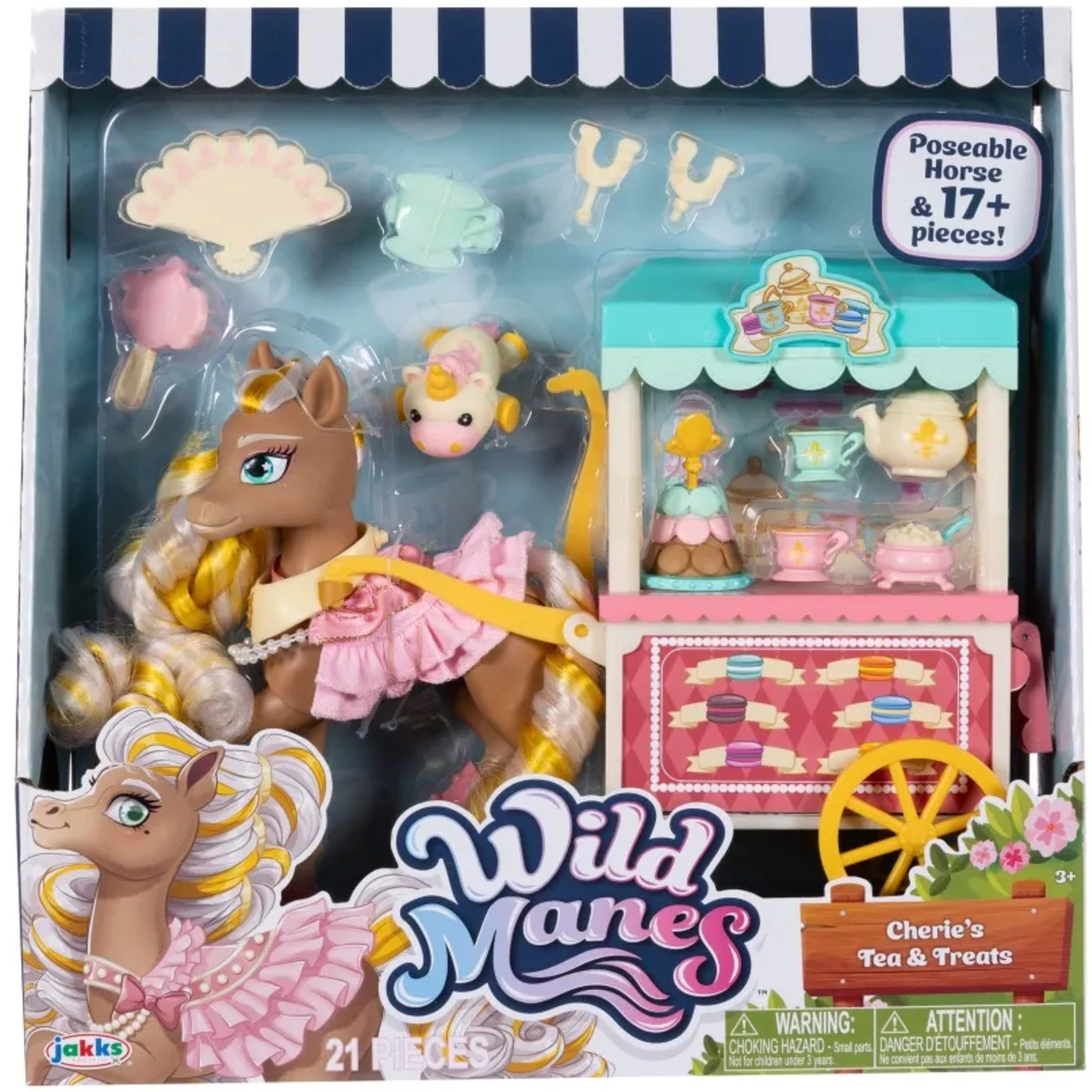 Okúzľujúca sada inšpirovaná seriálom WILD MANES prináša figúrku poníka Cherie s parádnym čajovým vozíkom a bohatými doplnkami na kreatívne hranie. Poník má pohyblivé končatiny, dlhú hrivu so zlatými pramienkami a môže držať príslušenstvo vďaka klipsom v tvare podkovy. Ideálny darček pre deti od 3 rokov, ktoré milujú fantazijné príbehy a štýlové čajové posedenia.