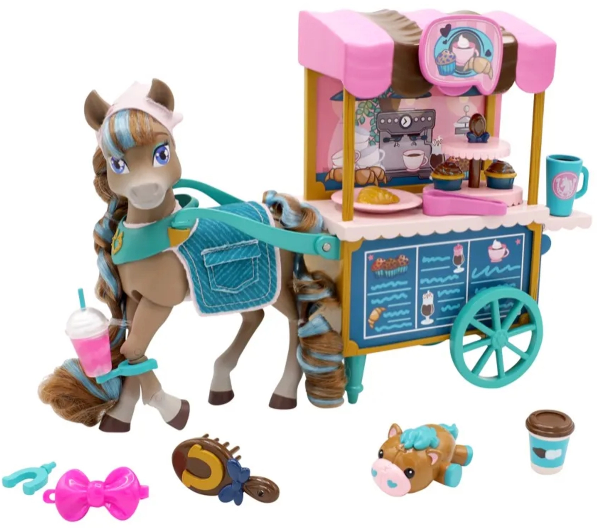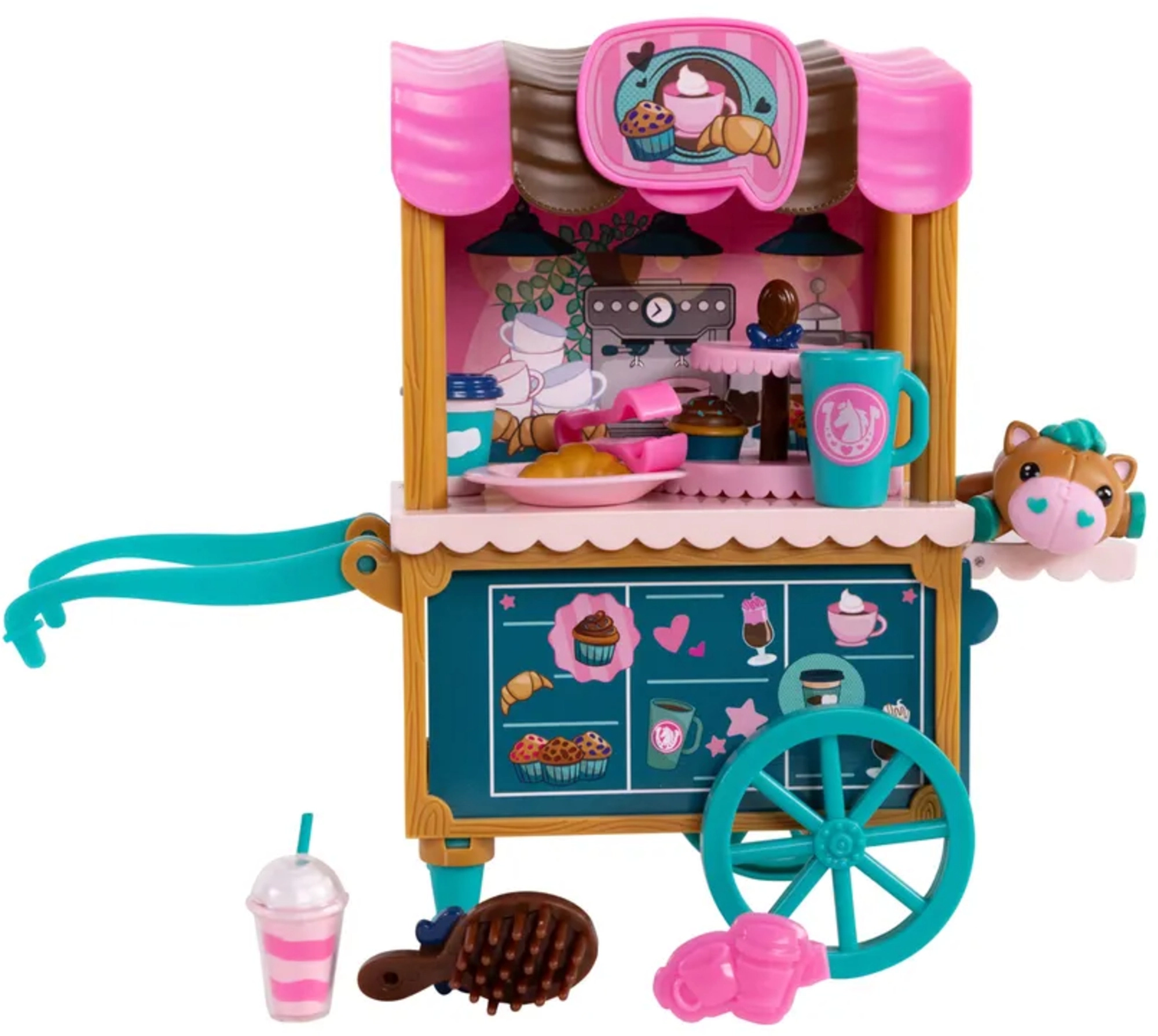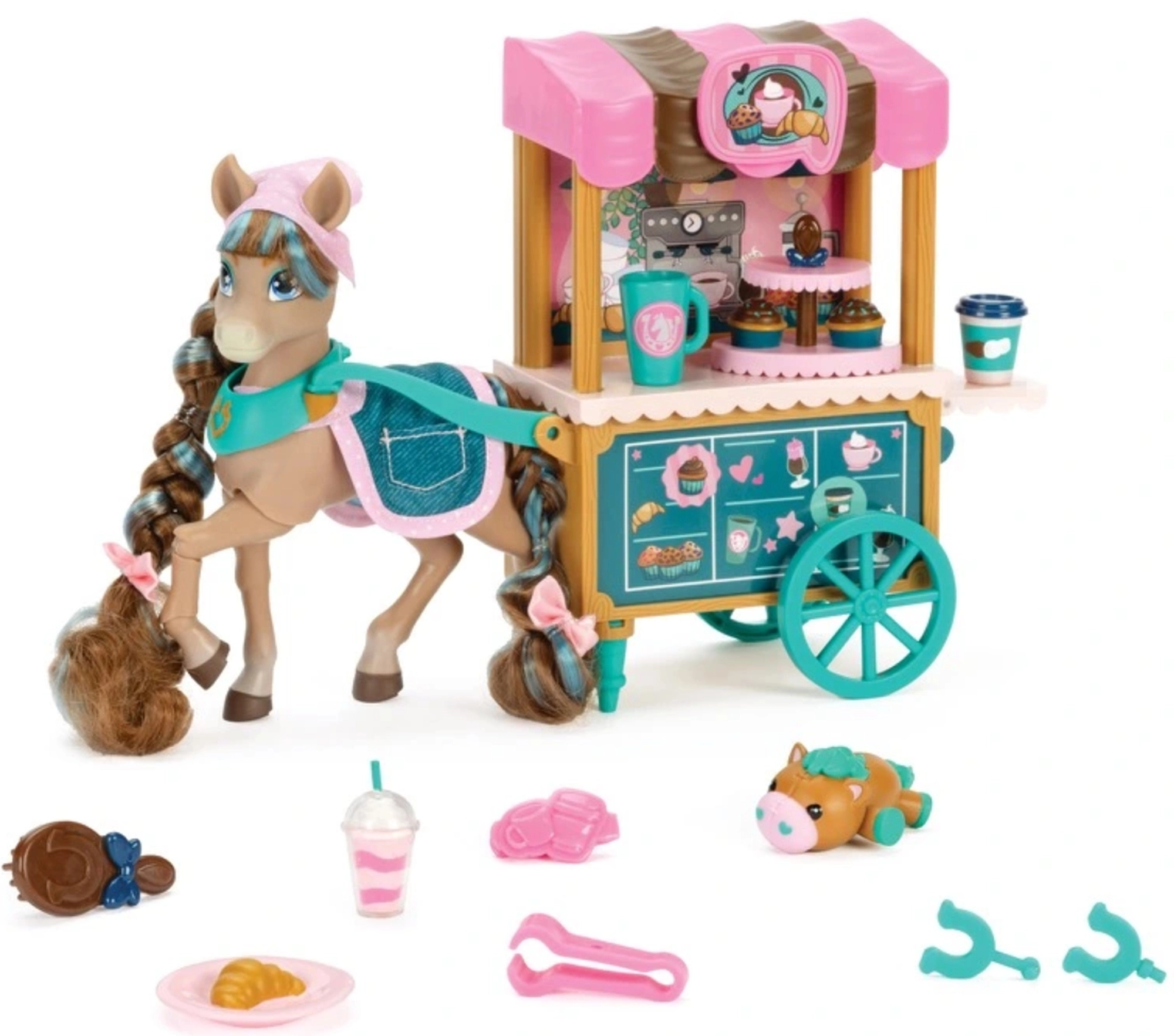 Vozík má otáčavé kolieska, madlo a poličky na dobroty, farebnú striešku a grafiku kaviarne. Set zahŕňa tiež servírovacie a pekárenské doplnky, malého maznáčika a kefku na úpravu hrivy. Všetko je navrhnuté pre kreatívny role-play, rozvoj jemnej motoriky a sociálnej hry.