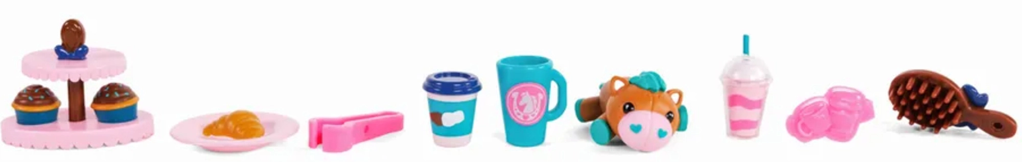 V balení nájdete zákusky, nápoje, kefku, stojan na cupcakes a rozkošného maznáčika – všetko pre hodiny zábavy a starostlivosti o koníka.