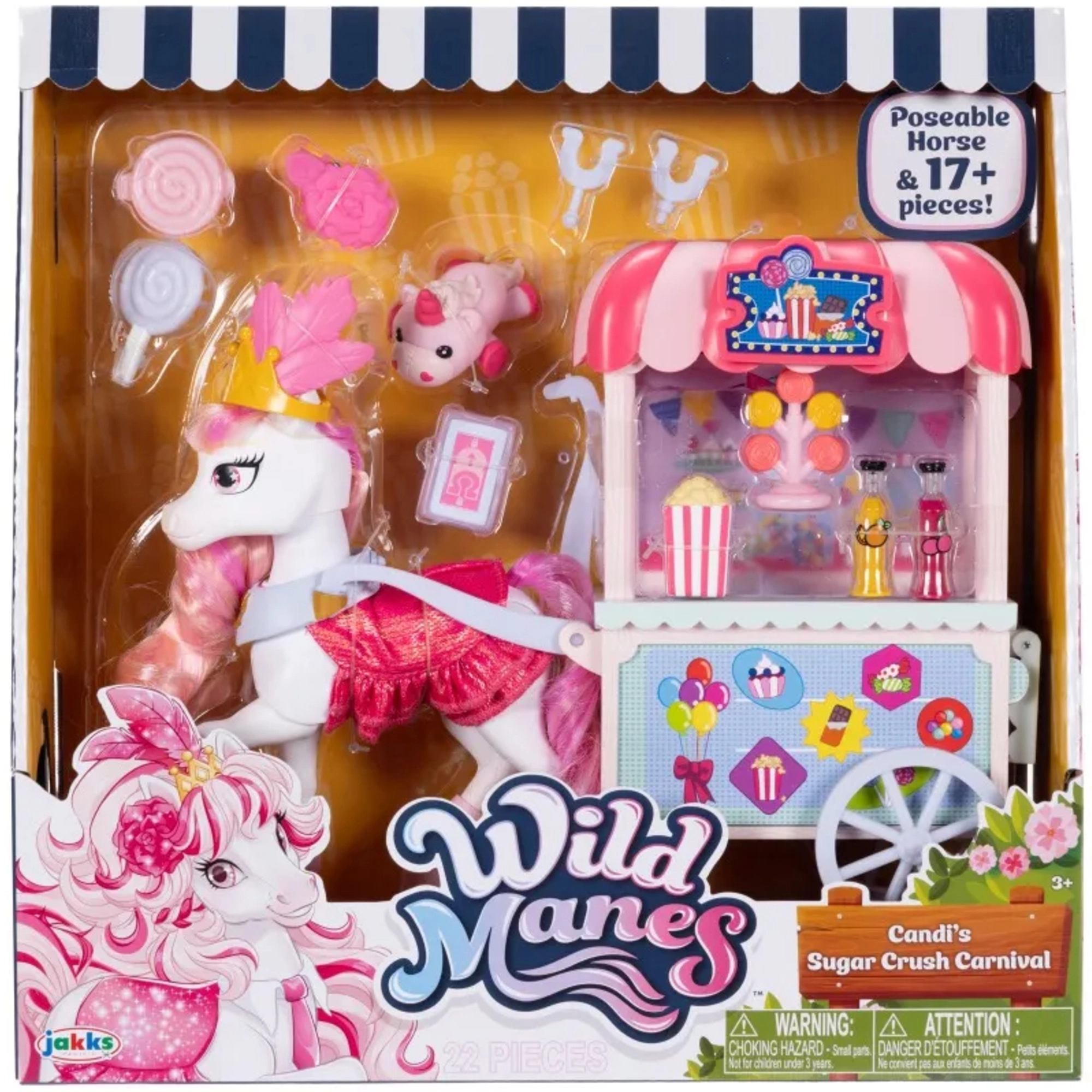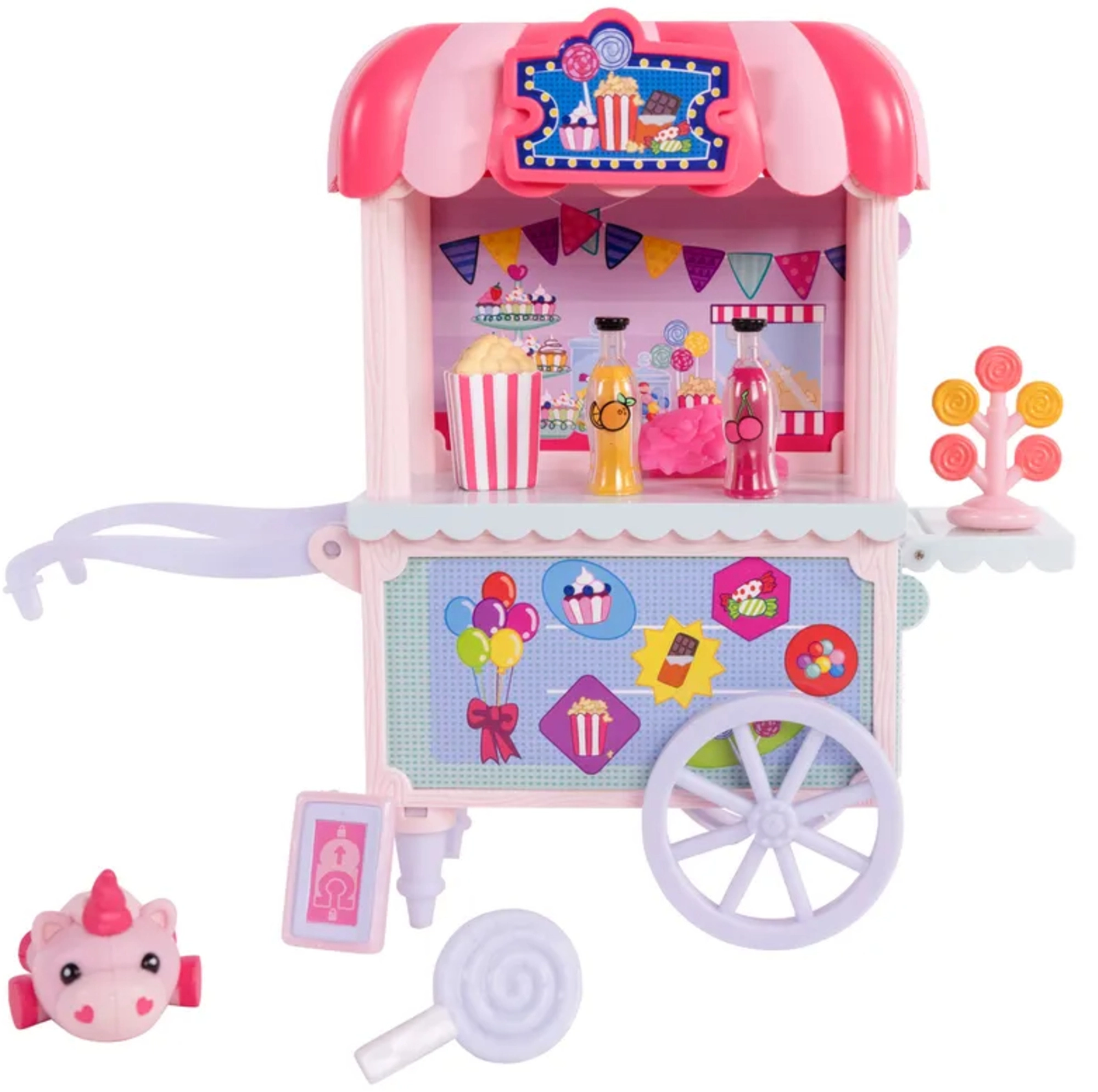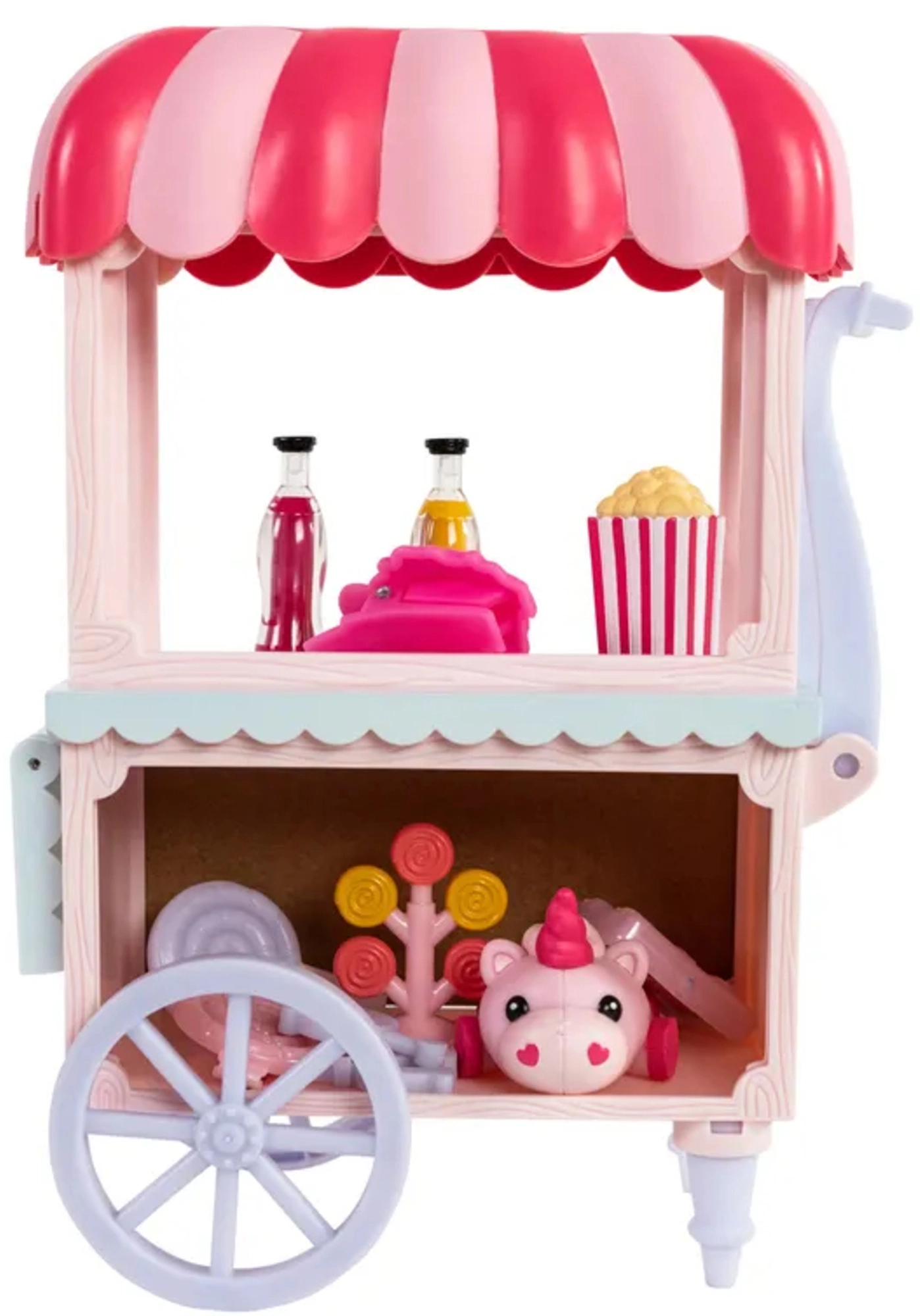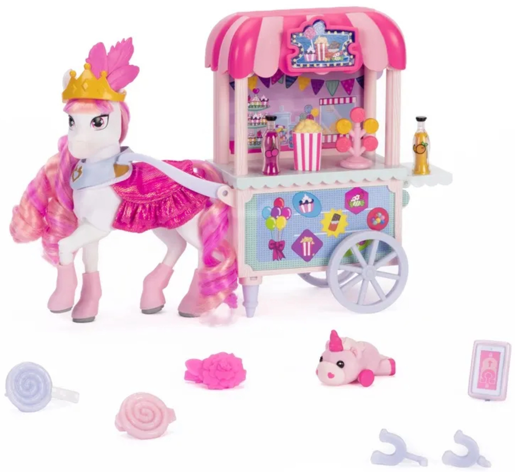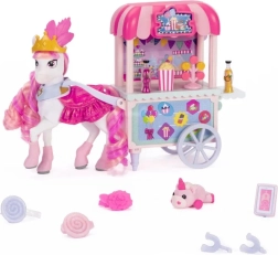 Farebný stánok Sugar Rush Carnival s pruhovanou strieškou a funkčnými kolieskami je pripravený na predaj popcornu, lízaniek a nápojov. Pomocou tiahla/ojky možno vozík pripojiť k Candi a vyraziť na sladkú jazdu mestečkom Mane Lane. Súčasťou sú aj drobné doplnky na starostlivosť a styling – kefka, sponky a ďalšie.