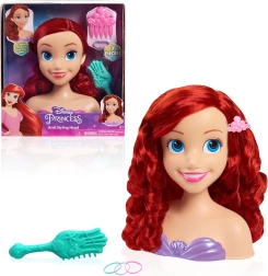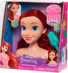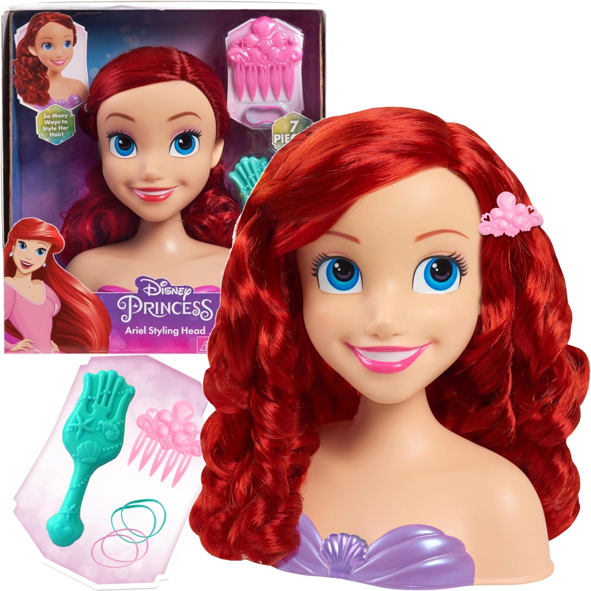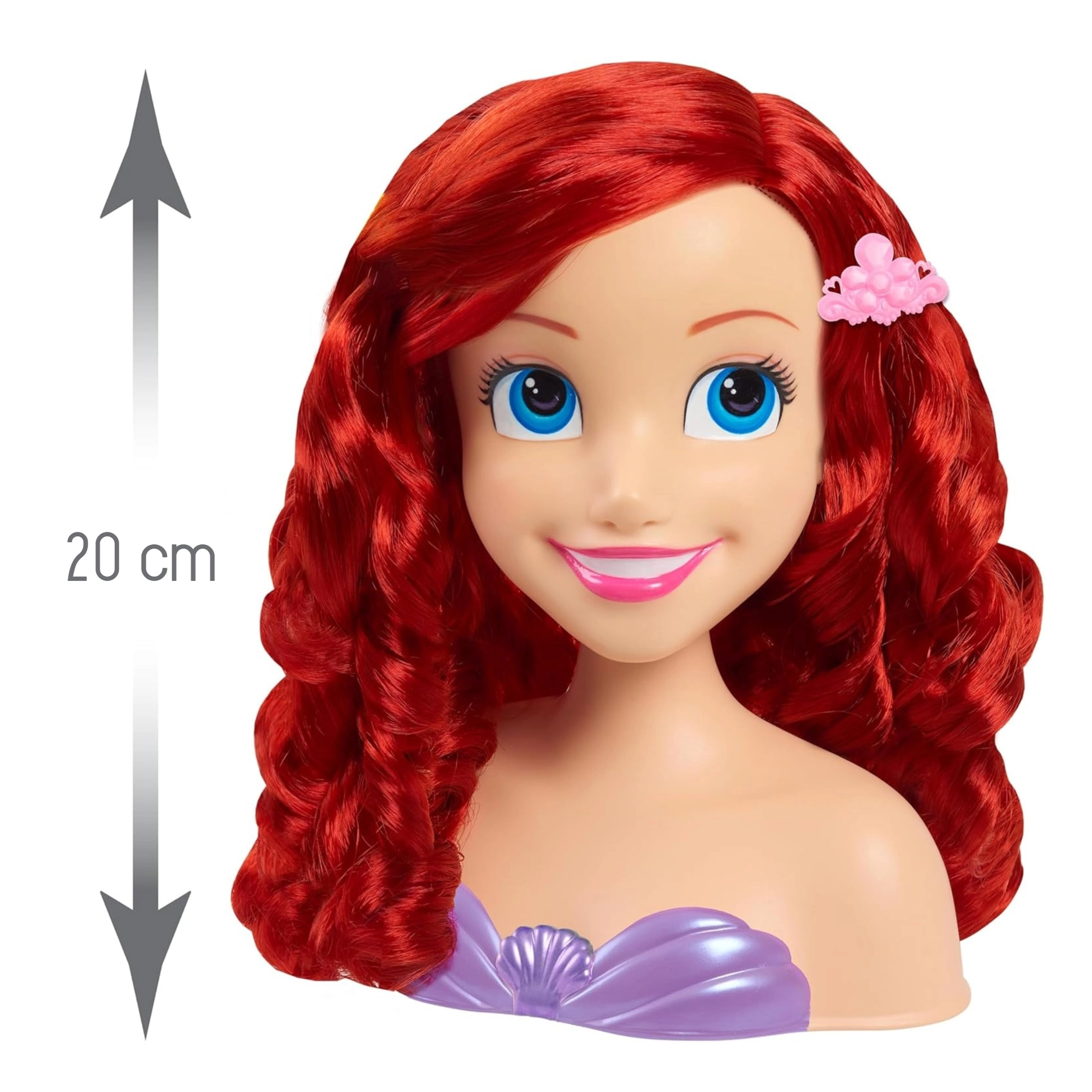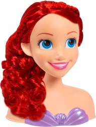 Hlava na česanie DISNEY Princezná Ariel verne zobrazuje obľúbenú morskú pannu s modrými očami a dlhými, kučeravými červenými vlasmi. Stabilné plastové poprsie s fialovým mušľovým topom uľahčuje styling a udržiava hlavu pevne na mieste, aby si deti mohli naplno užiť kadernícku hru.