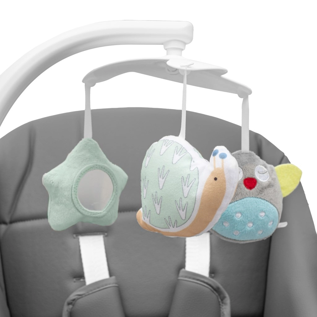 Ľahko umývateľné čalúnenie, 4 polohy sklonu operadla, priestranné sedadlo a pevná A-konstrukcia zabezpečujú pohodlie a bezpečie každý deň. Integrované melódie, rôzne rýchlosti hojdania a závesné hračky podporujú relax aj rozvoj dieťaťa.