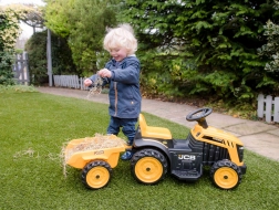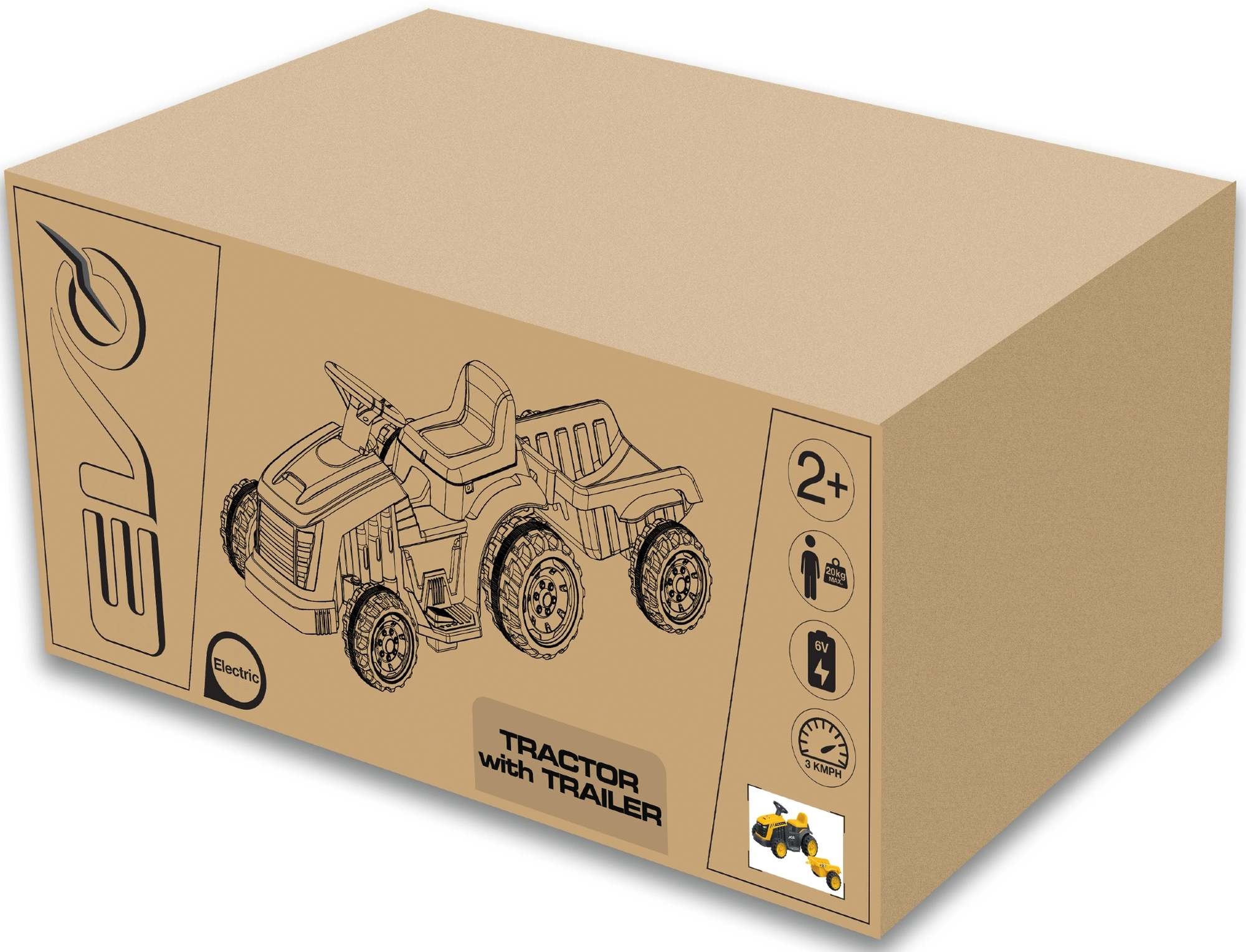 Malí farmári si užijú naloženie prívesu a odvoz hračiek či drobných pokladov. Stabilná štvorkolesová konštrukcia, protišmykové opierky a pevné materiály zaisťujú pohodlnú jazdu a dlhú životnosť. Ovládanie je intuitívne – štart tlačidlom, jazda vpred, riadenie volantom.