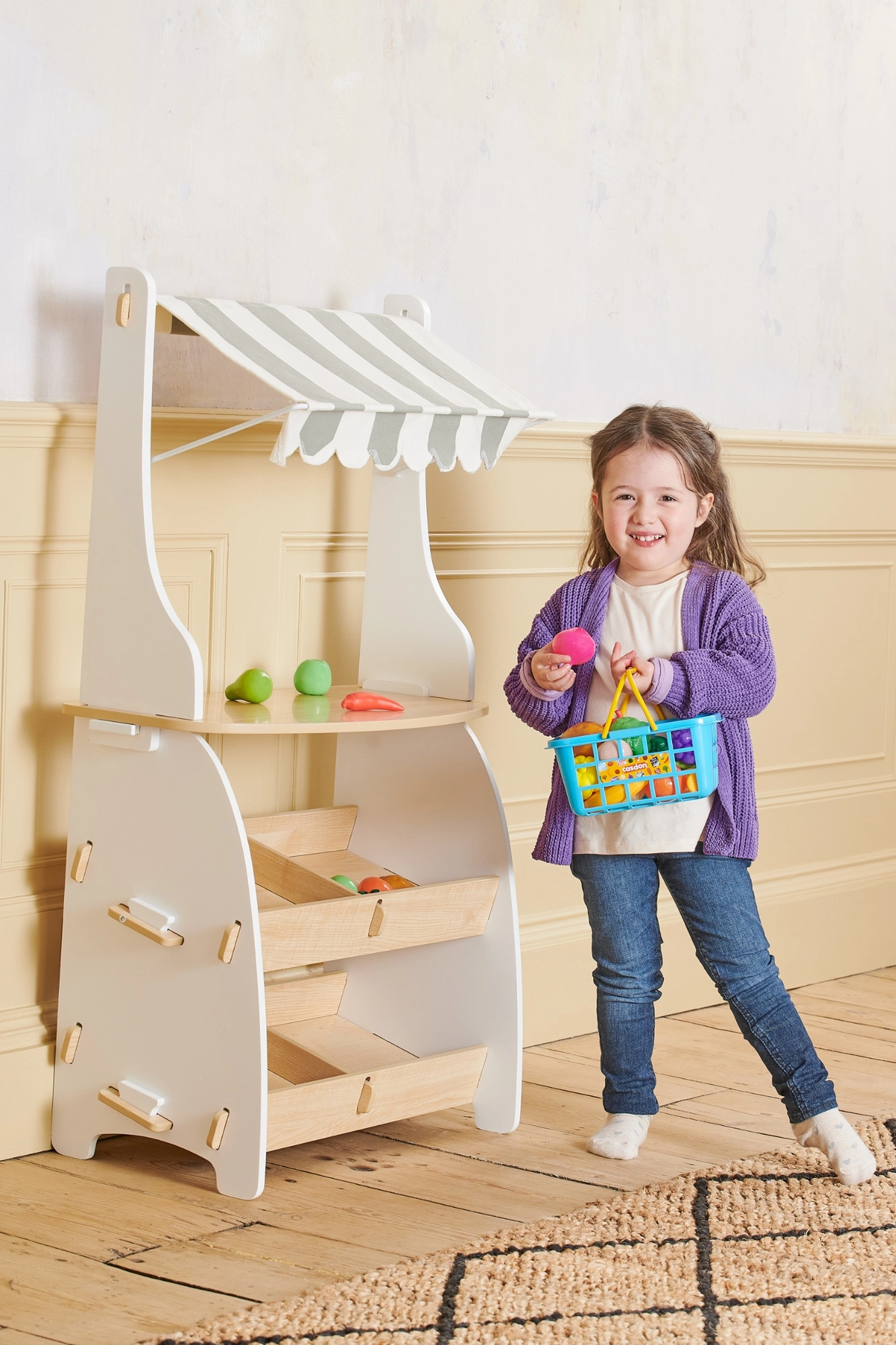 Súčasťou je pestrá zmes plastových potravín, ktoré podporujú učenie farieb, názvov a rolovú hru na nakupovanie a varenie.