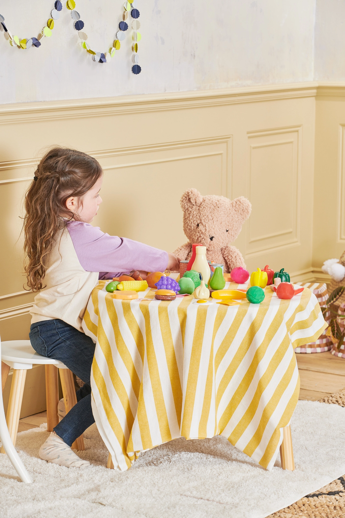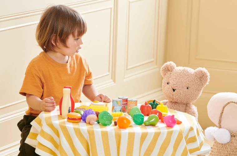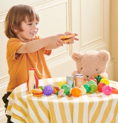 Od čerstvého ovocia a zeleniny až po konzervy a obľúbené dobroty – deti si ľahko pripravia raňajky, obed aj večeru a nacvičia nakupovanie i servírovanie.