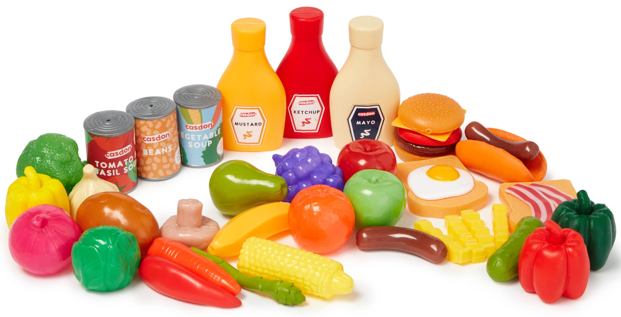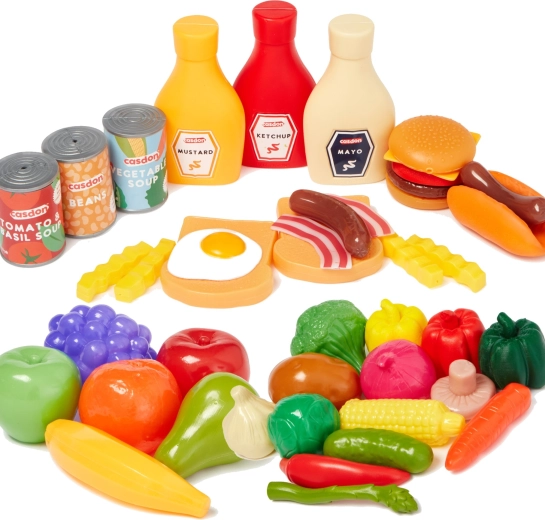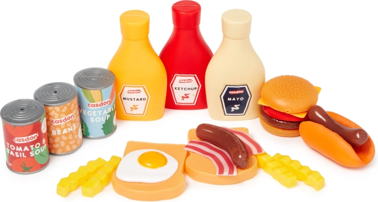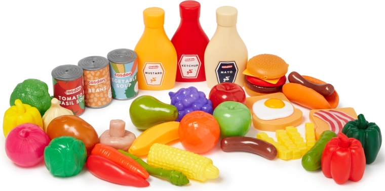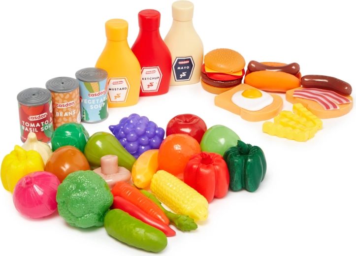 Táto bohatá sada detských potravín CASDON ponúkne všetko, čo deti potrebujú pre realistickú hru na varenie a nakupovanie. Nájdete v nej plastové ovocie a zeleninu (banán, jablko, uhorka, hrozno, cibuľa, paprika, paradajka, brokolica), imitácie balených výrobkov (konzervy, kečup, horčica, majonéza) aj obľúbené pochúťky ako hamburger, hot dog, hranolky či hrianky s vajíčkom a slaninou.