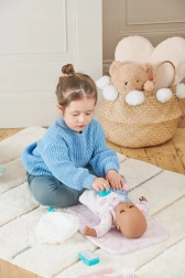 Deti môžu trénovať prebaľovanie, česanie a ošetrenie bábiky so sadou doplnkov, ktoré vyzerajú ako skutočné – ideálne na rozvoj empatie a hry na role.