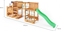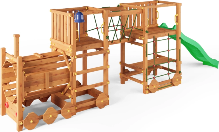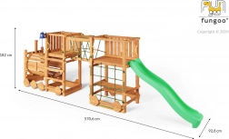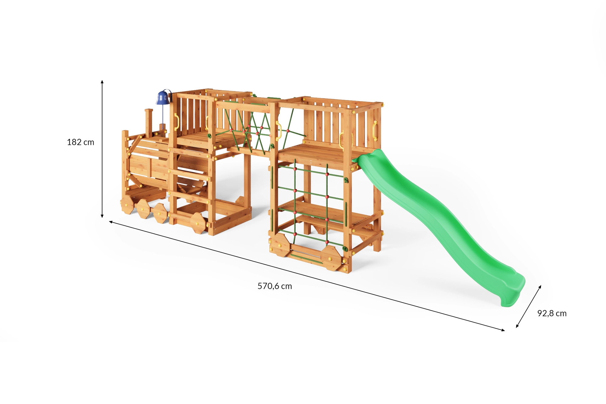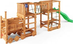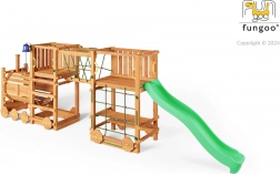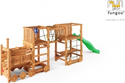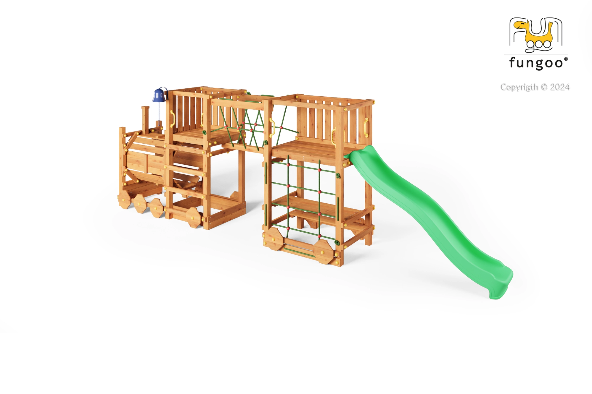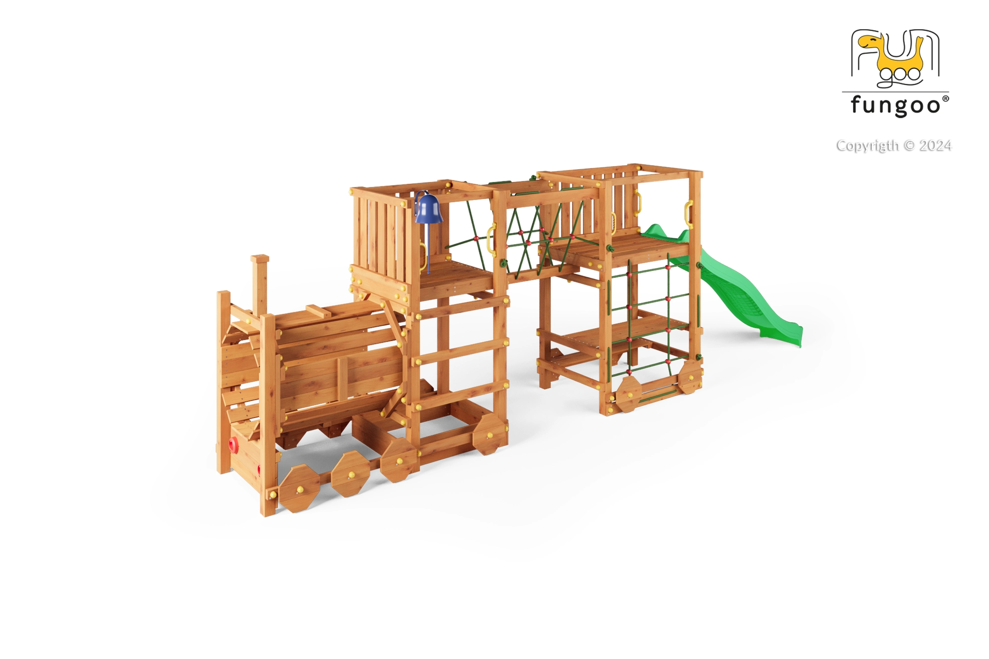 Ihrisko FUNGOO Loco Express spája bezpečnú drevenú konštrukciu s pútavou vlakovou témou, ktorá podnecuje predstavivosť. Deti môžu liezť, šmýkať sa, prechádzať lokomotívnym tunelom a oddychovať pri piknikovom stolíku pod platformou. Vďaka kvalitnému drevu s impregnáciou je zostava stabilná, trvácna a ideálna na celodenné hranie na čerstvom vzduchu.