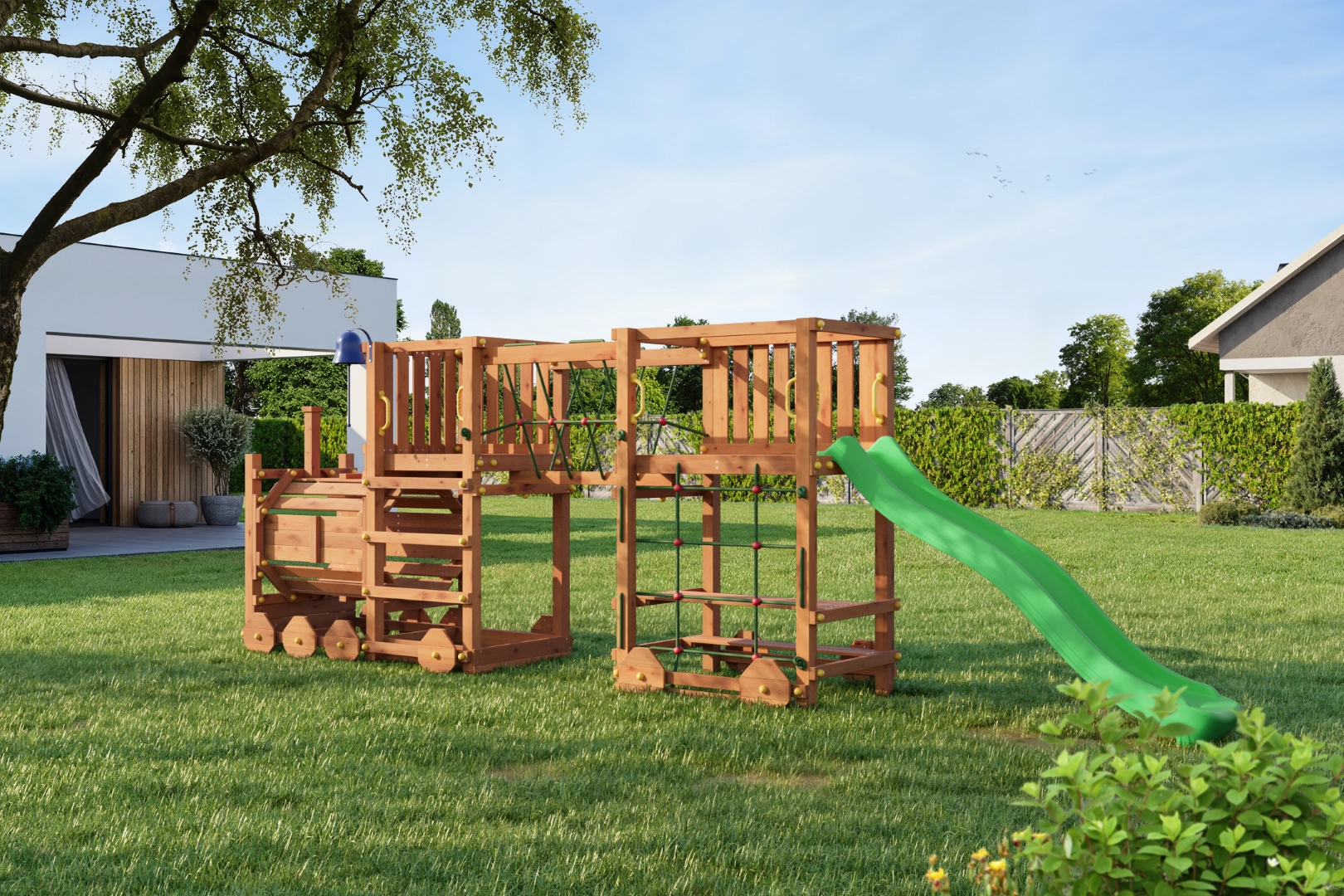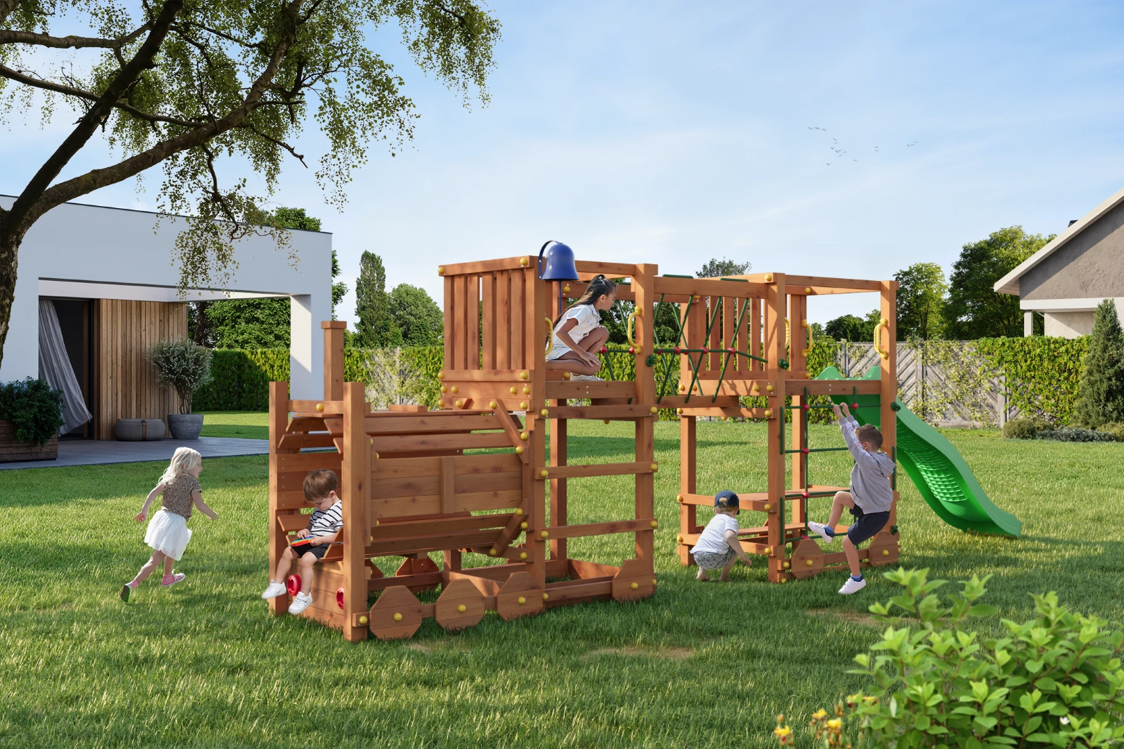 Premyslená výbava zlepšuje obratnosť, rovnováhu a koordinačné zručnosti. Lanový most a lezecká sieť rozvíjajú motoriku, šmykľavka 2,2 m prináša rýchlu zábavu a úchyty a zemné kotvy zaisťujú istotu pri prevádzke. Ihrisko je vhodné do súkromných záhrad pre deti od 3 rokov a do hmotnosti 50 kg na používateľa.