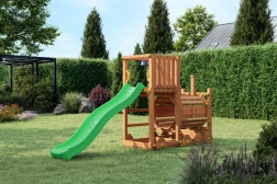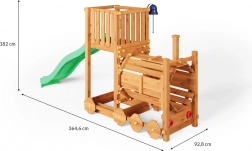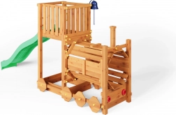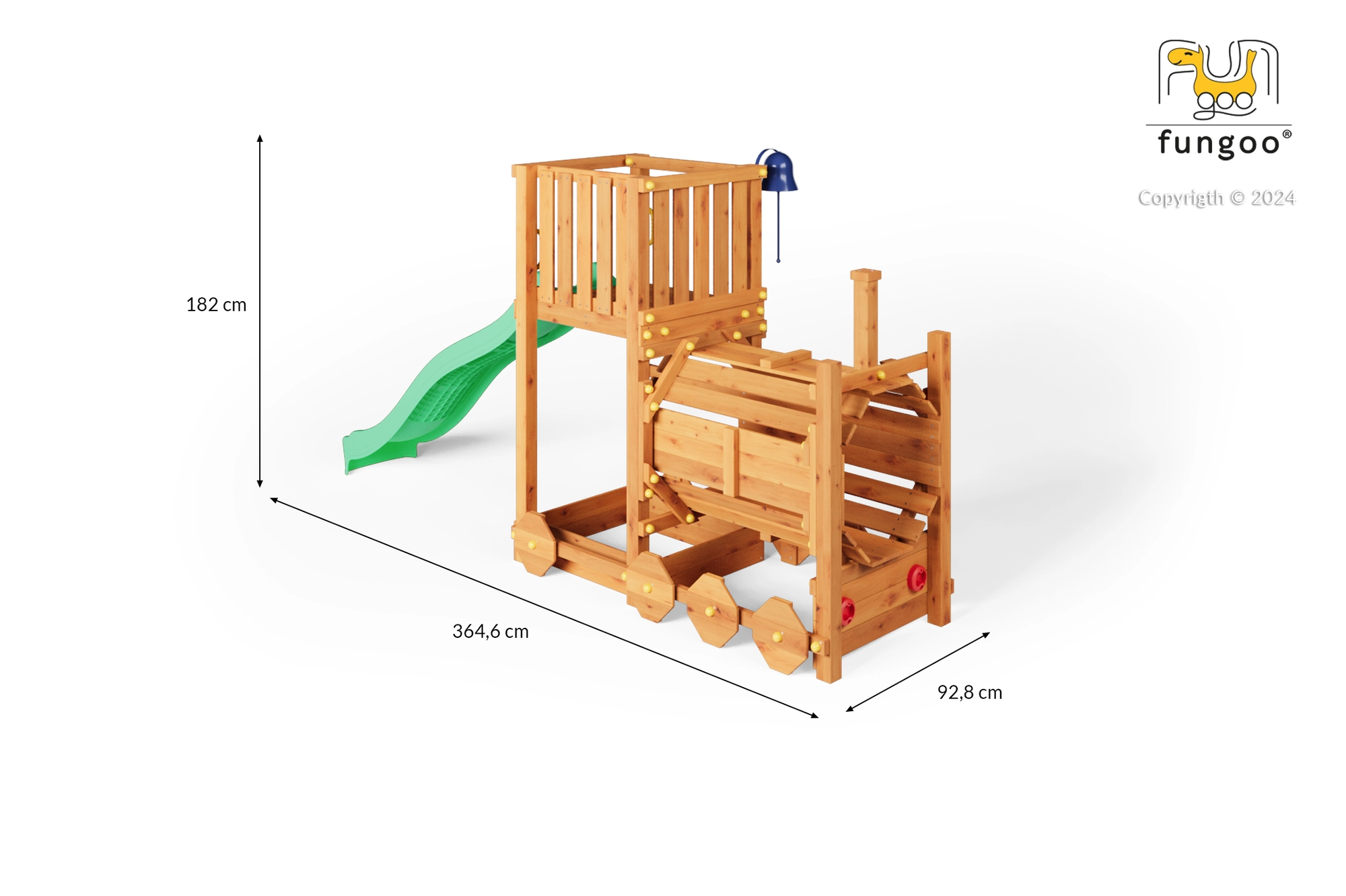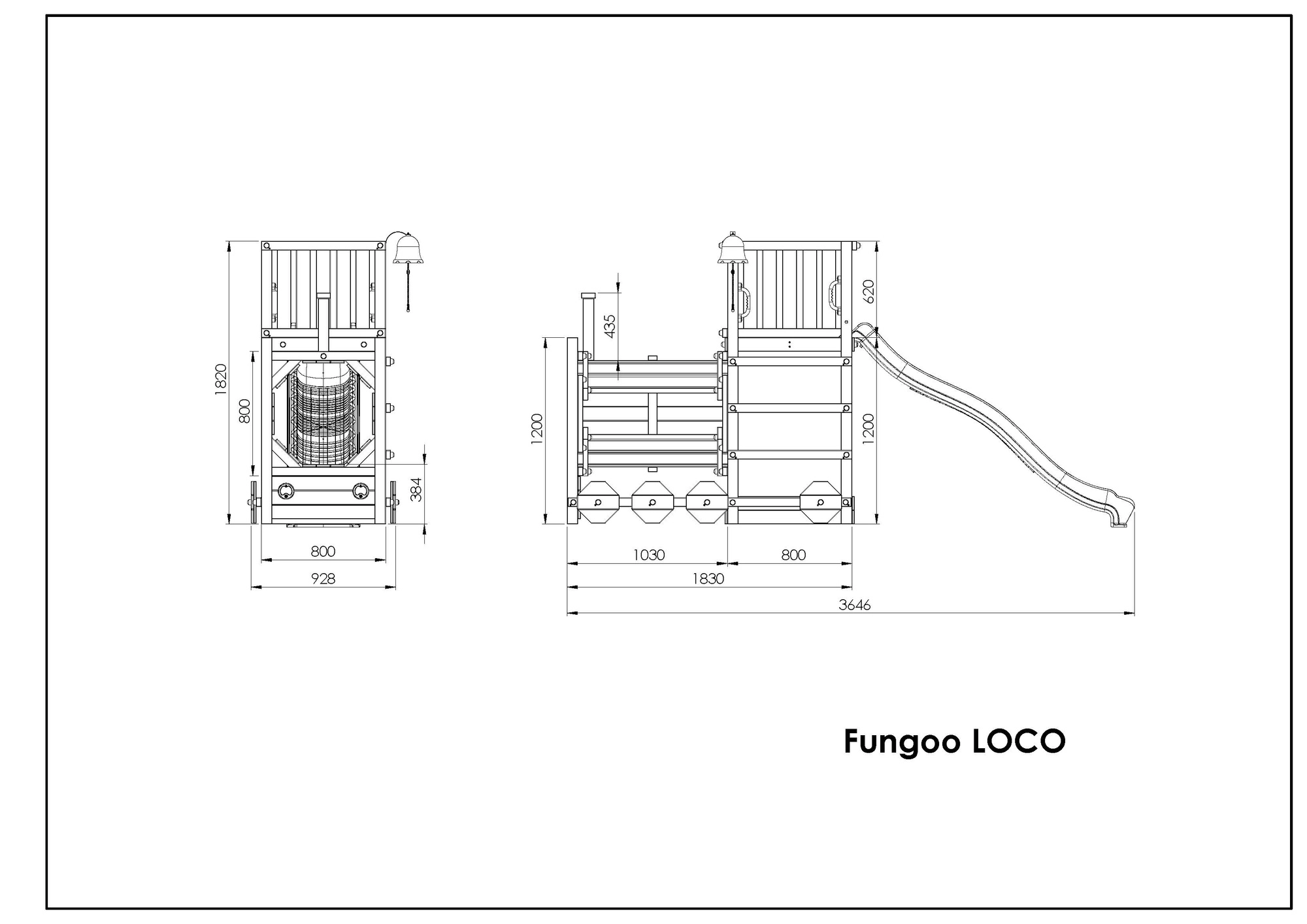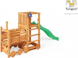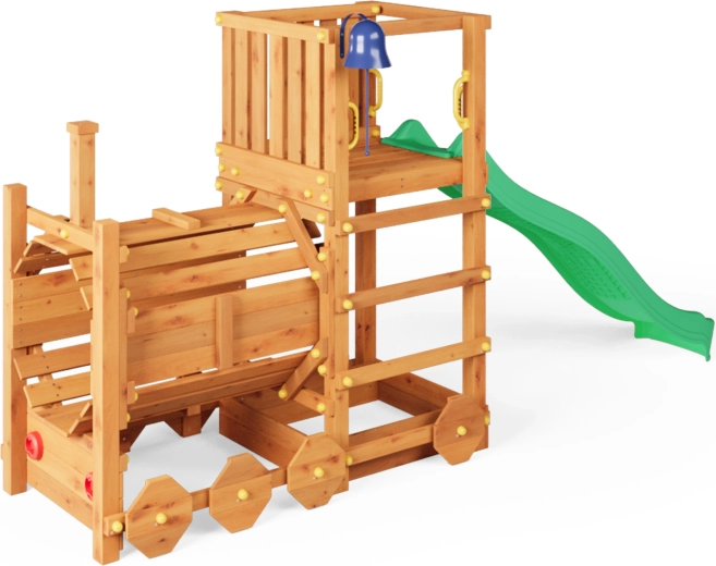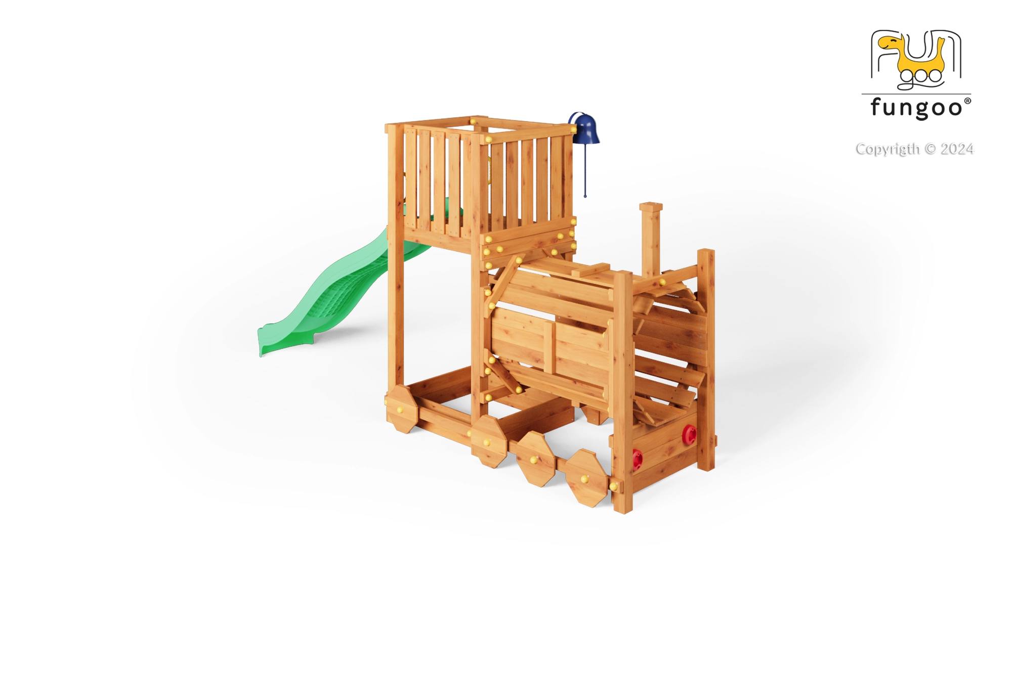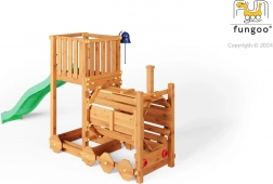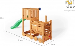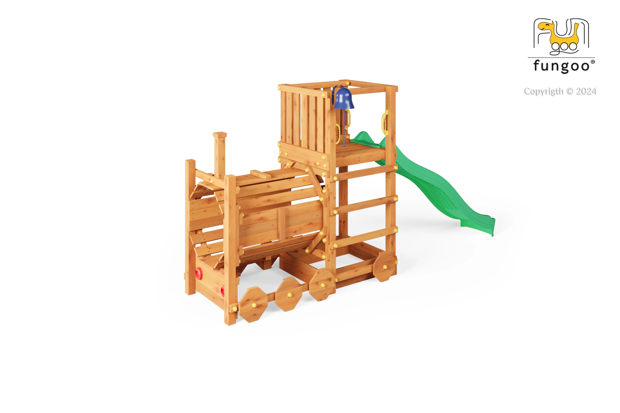 Ihrisko FUNGOO Loco je navrhnuté ako lokomotíva s tunelom, ktorá láka na lezenie, schovávanie aj role-play na rušňovodiča. Dlhá vlnitá šmykľavka 2,2 m zaistí množstvo zábavných jázd, zatiaľ čo zvonček podporí detskú predstavivosť a interaktívnu hru. Konštrukcia z kvalitného, impregnovaného dreva je odolná voči počasiu a bezpečne ukotvená do zeme.