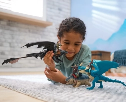 Obľúbená sada z univerza DREAMWORKS Dragons prináša filmovo verné prevedenie s dôrazom na autentické detaily – od textúry „šupín“ po tvarované sedlo pre jazdkyňu. Vďaka kĺbovým spojom možno drakovi roztiahnuť krídla do „letu“, nastaviť nohy aj chvost a figúrke Astrid upraviť paže pre akčné pózy.