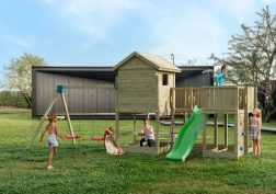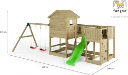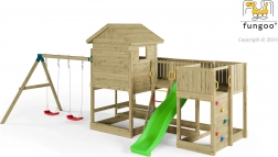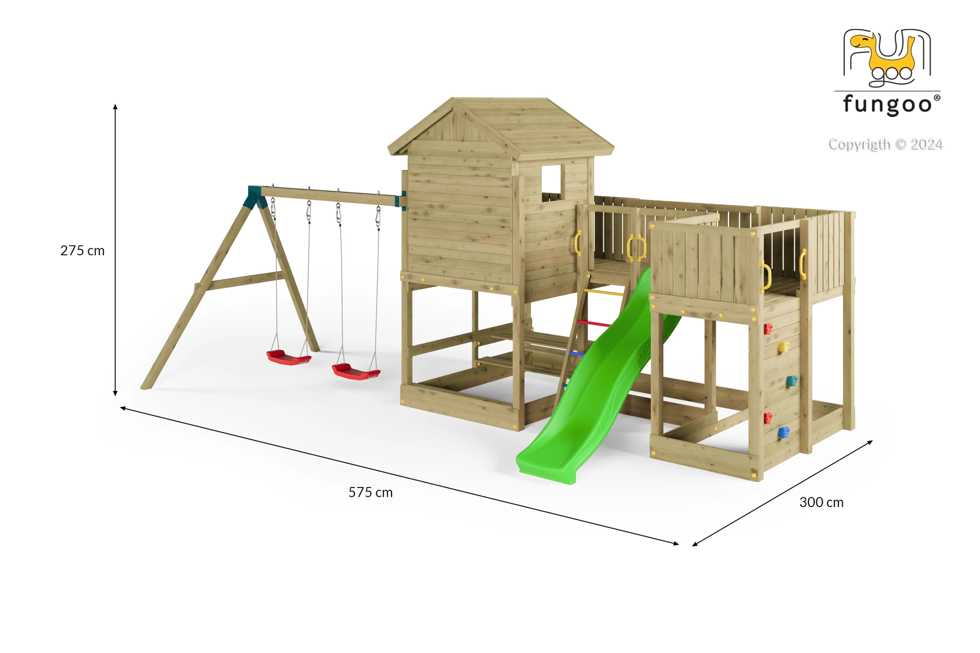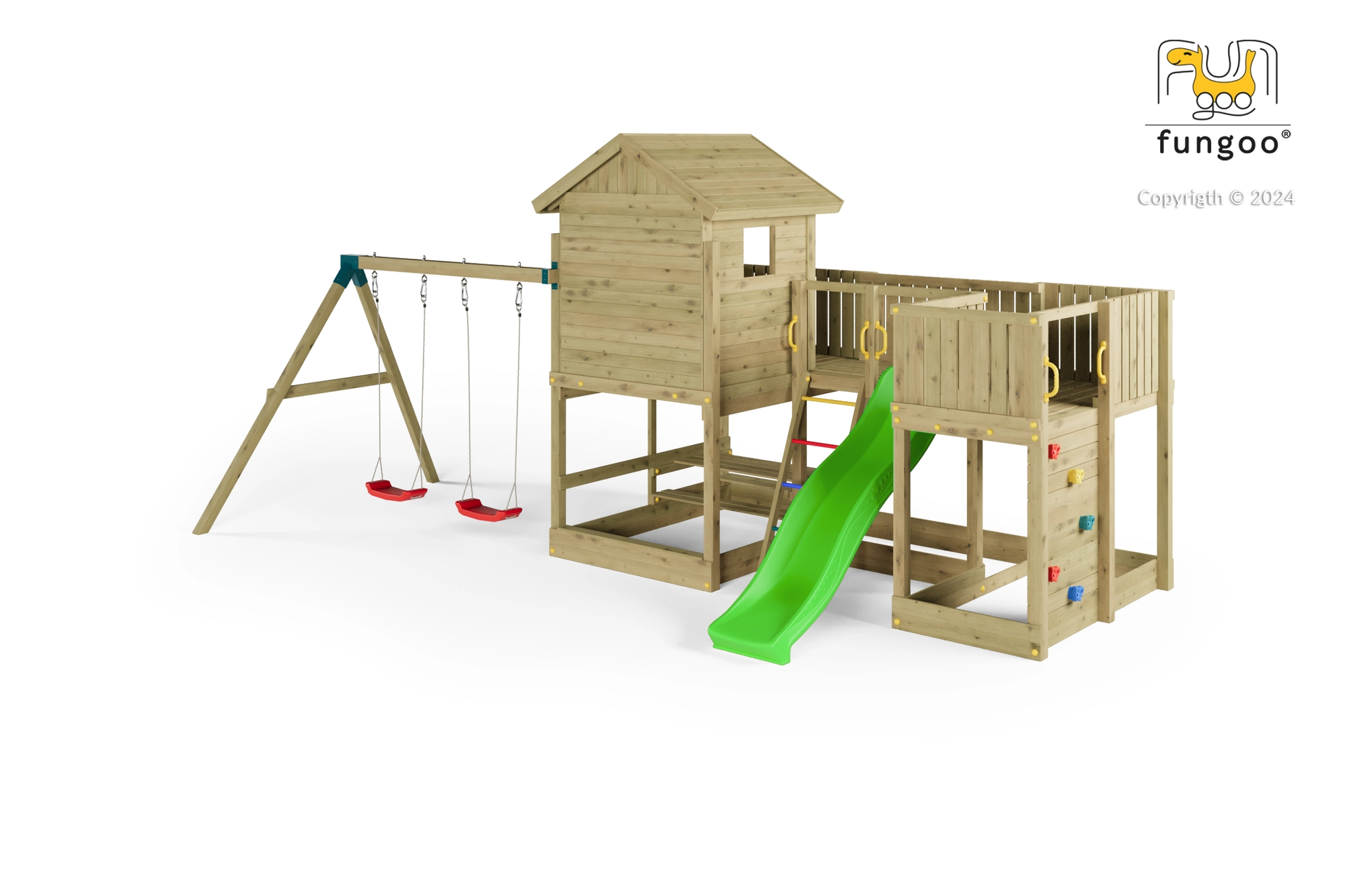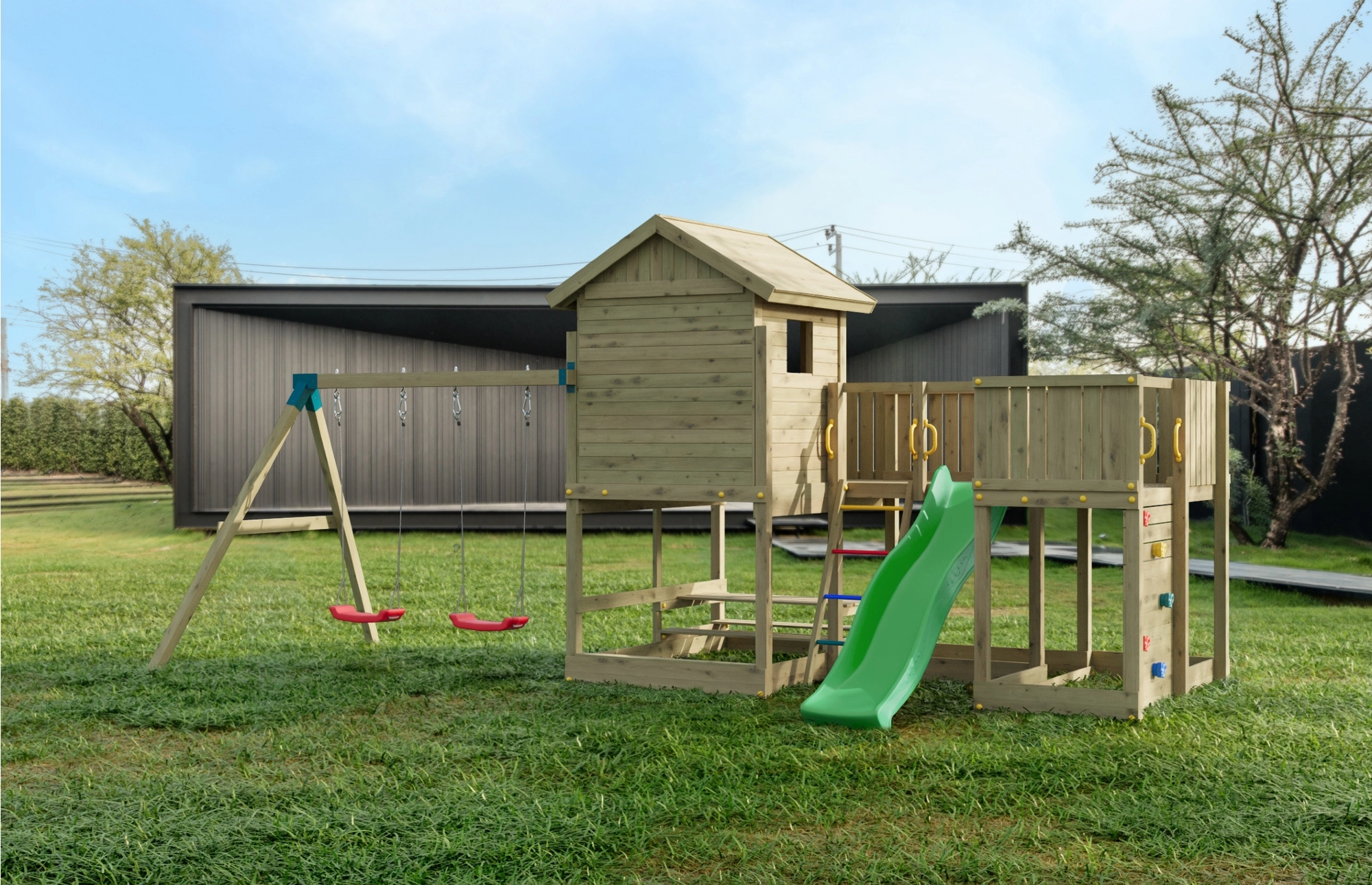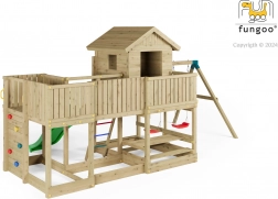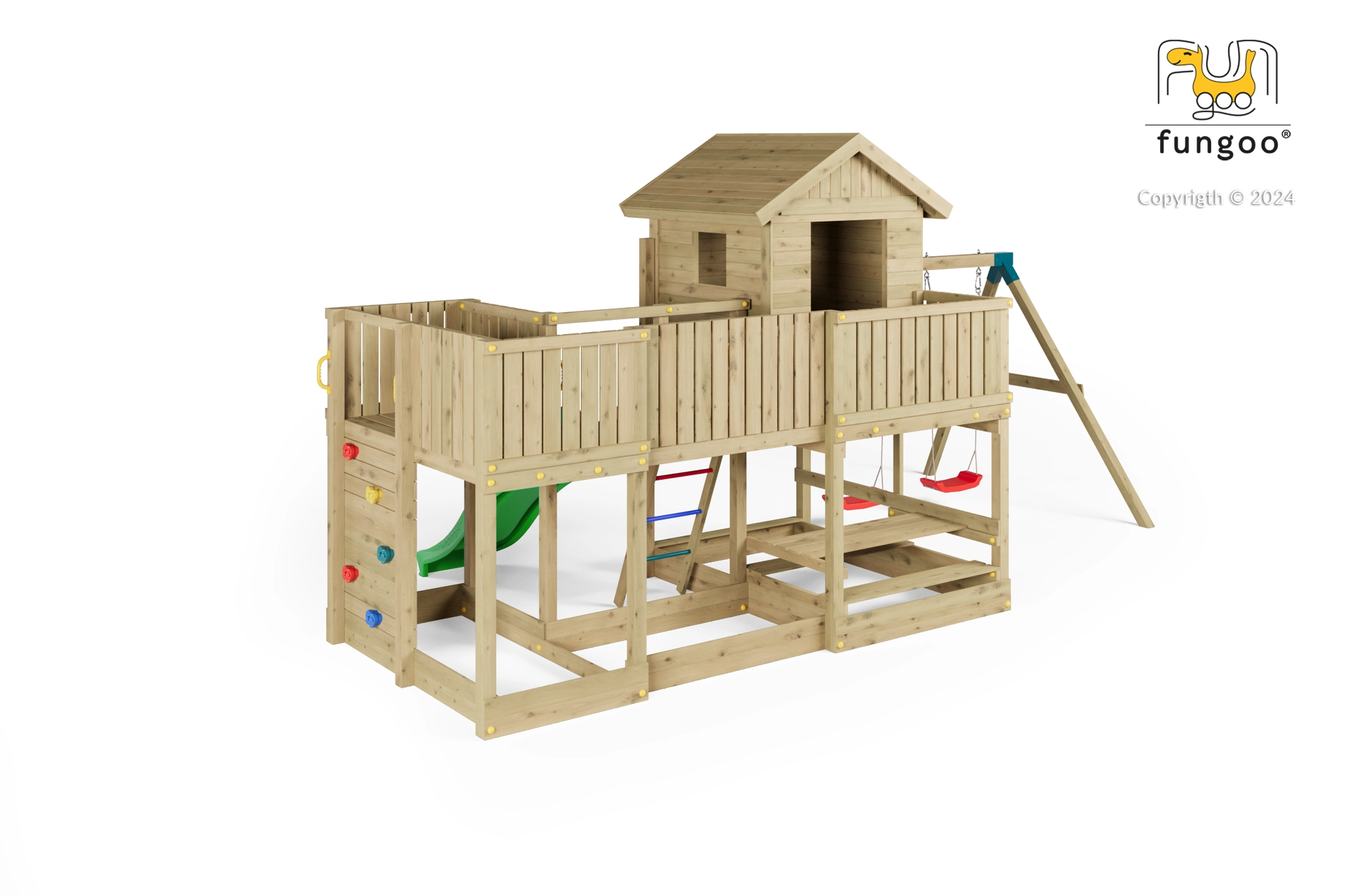 Fungoo Longstepper je komplexné záhradné ihrisko z kvalitného, tlakovo impregnovaného dreva, navrhnuté pre dlhú životnosť a každodennú zábavu. Vďaka premyslenému usporiadaniu prvkov rozvíja motoriku, rovnováhu aj fantáziu detí. Bezpečnosť zvyšujú madlá, zábradlie a pevné kovové spoje.