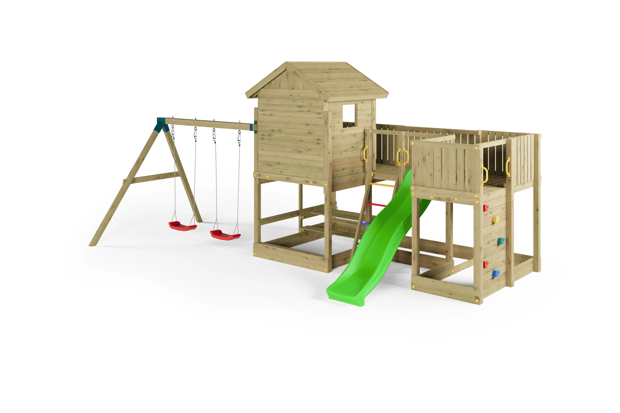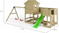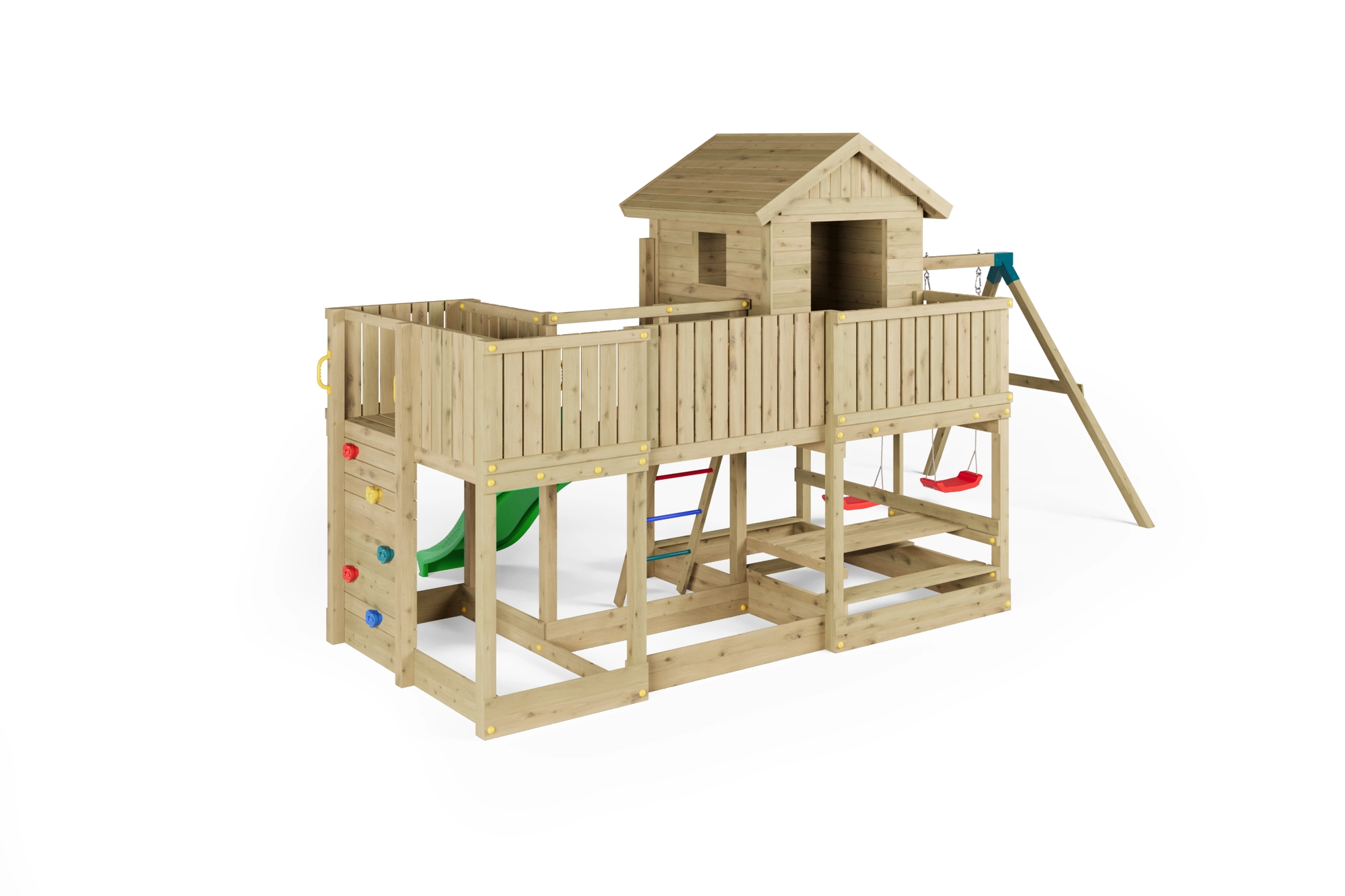 Zastrešený playhouse s ochranným zábradlím podporuje kreatívne hry. Na plošinu sa deti dostanú po rebríku s kovovými priečkami alebo cez lezeckú stenu s farebnými chytmi.