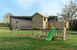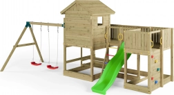 Dve nastaviteľné hojdačky, lezecká stena a pieskovisko so stolíkom pod platformou zabavia viac detí súčasne a rozvíjajú motoriku aj predstavivosť.