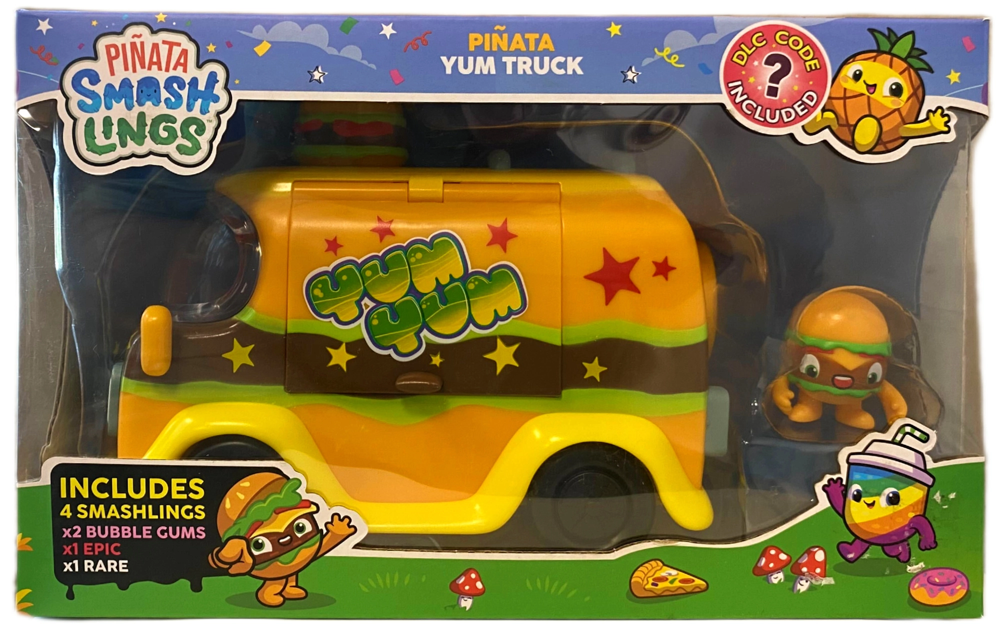 Objavte tropický svet sladkostí, kde z dúhových pinát ožívajú roztomilé a energické bytosti Smashlings. Tento oficiálny set Yum Truck Playset prináša štýlový food truck s otváracími dverami a interiérom pripraveným na párty, štyri farebné figúrky (cca 3,5–4 cm) a tri „foodie“ doplnky na servírovanie dobrôt. Vďaka DLC kódu navyše odomknete unikátny obsah v hre.