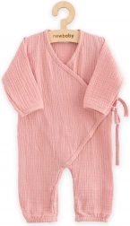 Tento ružový mušelínový overal New Baby je skvelou voľbou na každodenné nosenie aj spánok. Zavinovacie zapínanie uľahčuje manipuláciu s bábätkom, zatiaľ čo patenty medzi nožičkami urýchlia prebaľovanie. Mušelín je mimoriadne ľahký, mäkký a priedušný, takže pomáha regulovať teplotu a znižuje riziko prehriatia.
