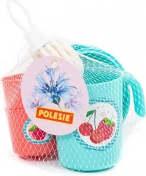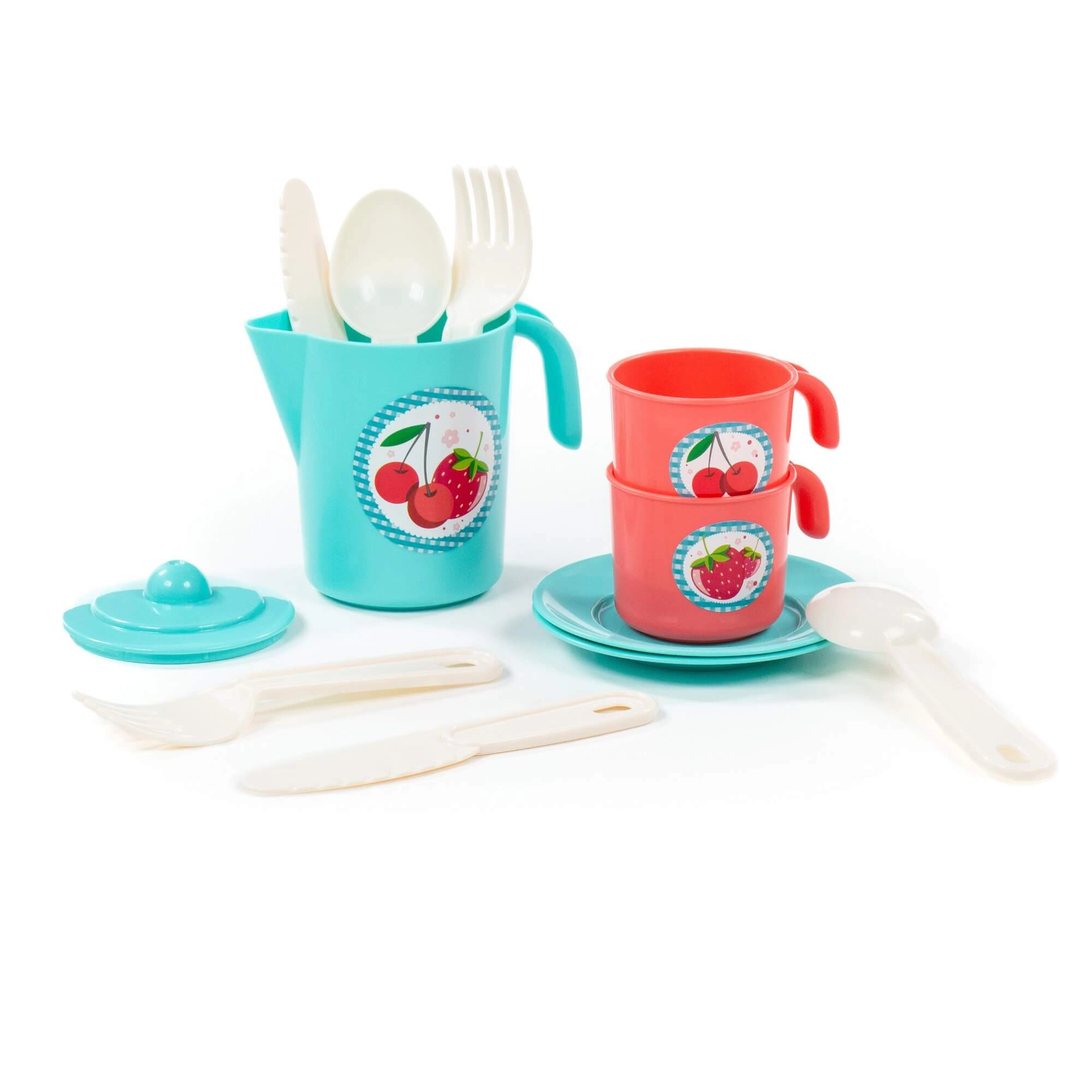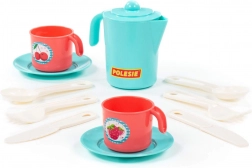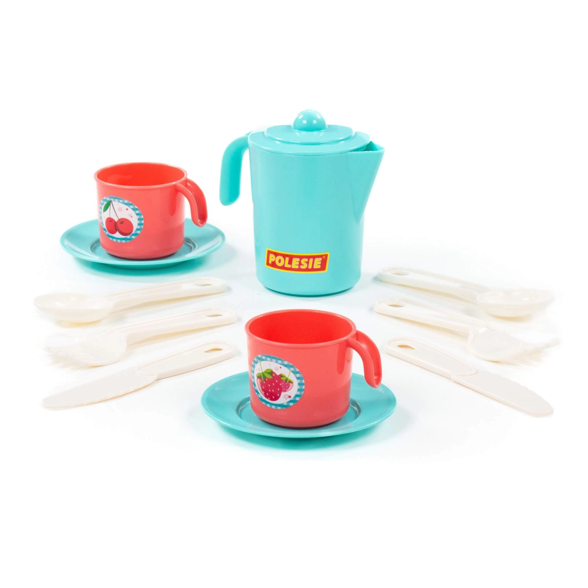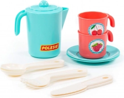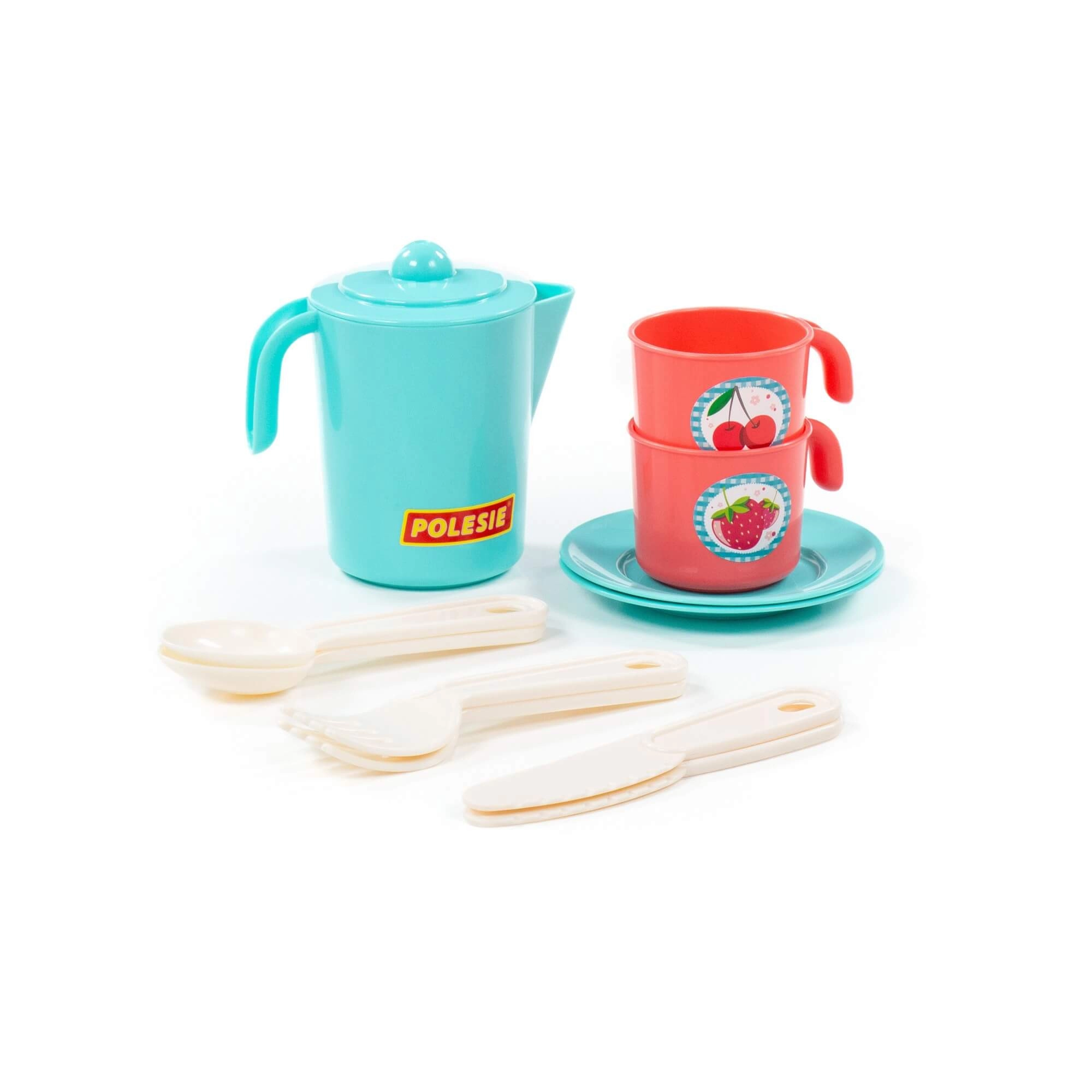 Súprava obsahuje kanvičku s viečkom, 2 hrnčeky s uškami, tanieriky/podšálky a plastové príbory. Vďaka bezpečným, hladkým hranám a nízkej hmotnosti sa s riadikom ľahko manipuluje. Kompaktné rozmery cca 130 × 105 × 121 mm uľahčujú ukladanie aj prenášanie.