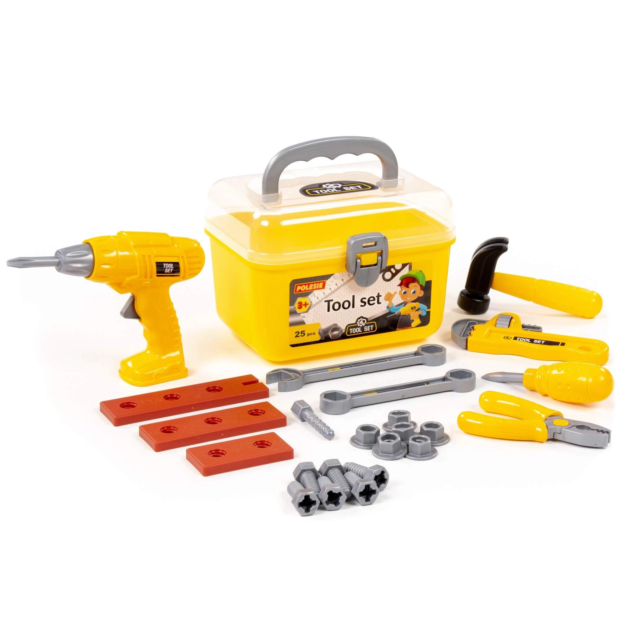 Súčasťou sú obľúbené nástroje na detské kutilstvo – napríklad vŕtačka, kladivo, skrutkovač, kliešte, kľúče, matice a skrutky na skrutkovanie a montovanie.