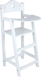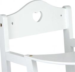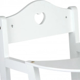 Táto drevená jedálenská stolička pre bábiky v čisto bielej farbe je štýlovým doplnkom detskej izby aj obývačky. Decentný výrez srdca v operadle dodáva roztomilý vzhľad, zatiaľ čo pevná konštrukcia zaručuje bezpečnú a dlhodobú zábavu.