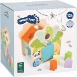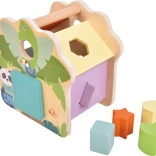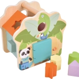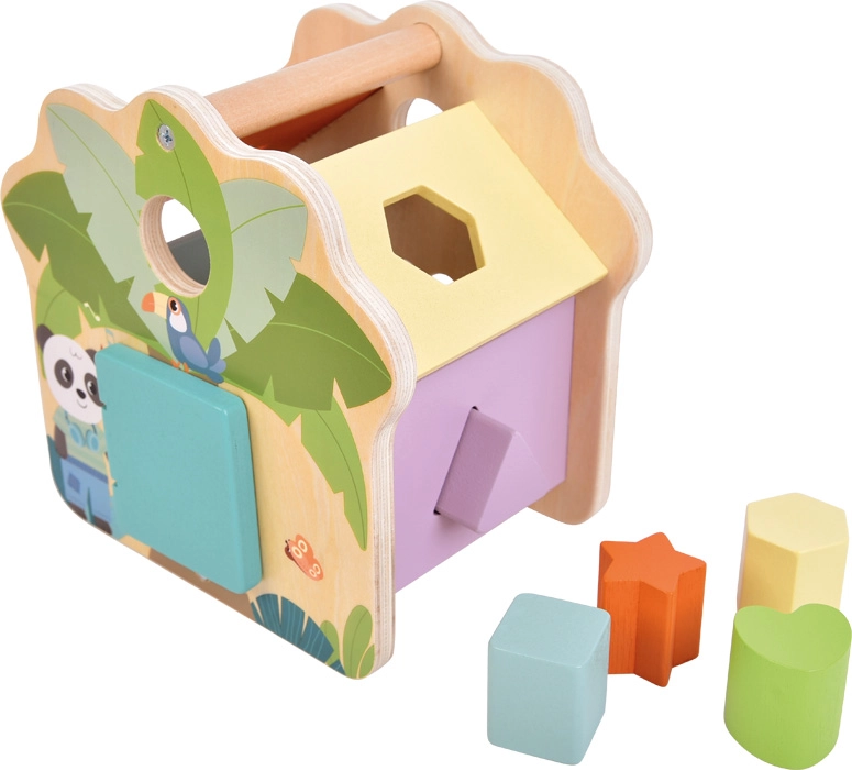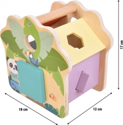 Drevený domček na vkladanie tvarov s roztomilými ilustráciami pandy, tigra a paliem prevedie deti svetom farieb a tvarov. Päť rôznych kociek deťom pomáha trénovať presnosť pohybov a trpezlivosť – po vložení všetkých dielikov sa dvierka ľahko otvoria a zábava môže začať znova.