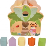 Objavte hravú drevenú vkladačku s motívom džungle, ktorá rozvíja detské zručnosti už od 1 roku. Domček z FSC 100% dreva ponúka 5 farebných tvarov na vkladanie, podporuje jemnú motoriku, logické myslenie a koordináciu ruka-oko. Vďaka praktickej rukoväti je ideálna na cesty aj domov a hladké, zaoblené hrany zaisťujú bezpečné hranie.