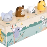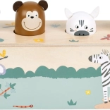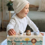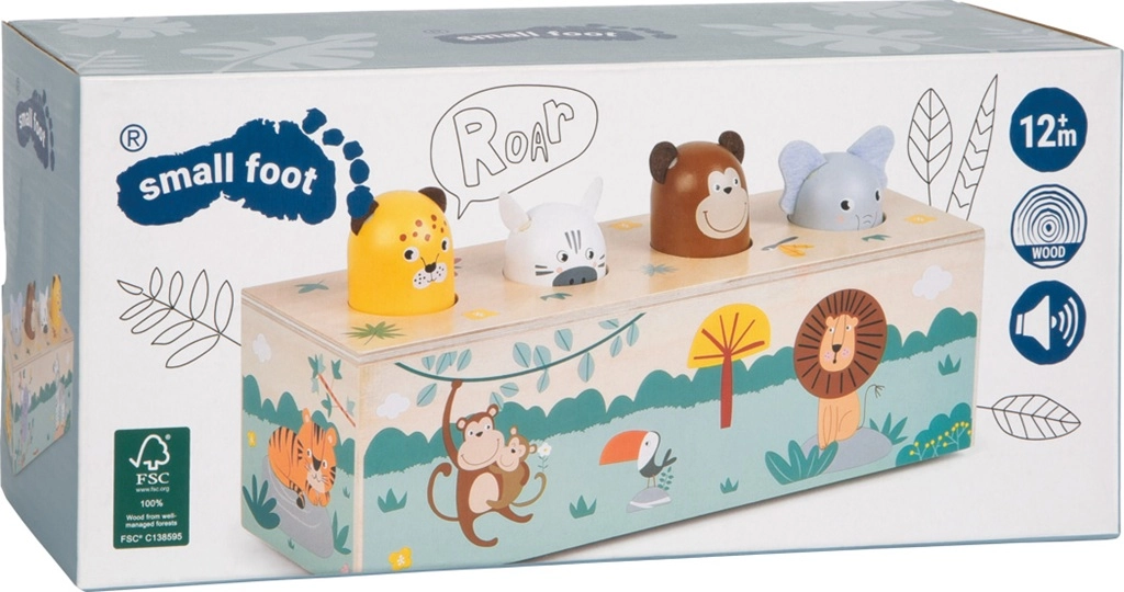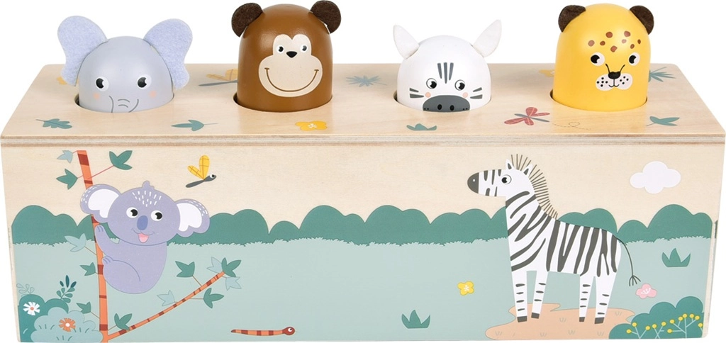 Interaktívna drevená hračka z FSC 100% certifikovaného dreva prináša zábavu aj učenie v jednom: po stlačení sa hlavičky zvierat vyskočia a ozvú sa autentické zvuky slona, opice, zebry a leoparda. Podporuje jemnú motoriku, sluchové vnímanie a pochopenie príčiny a následku, zároveň poteší robustným spracovaním a moderným safari dizajnom.