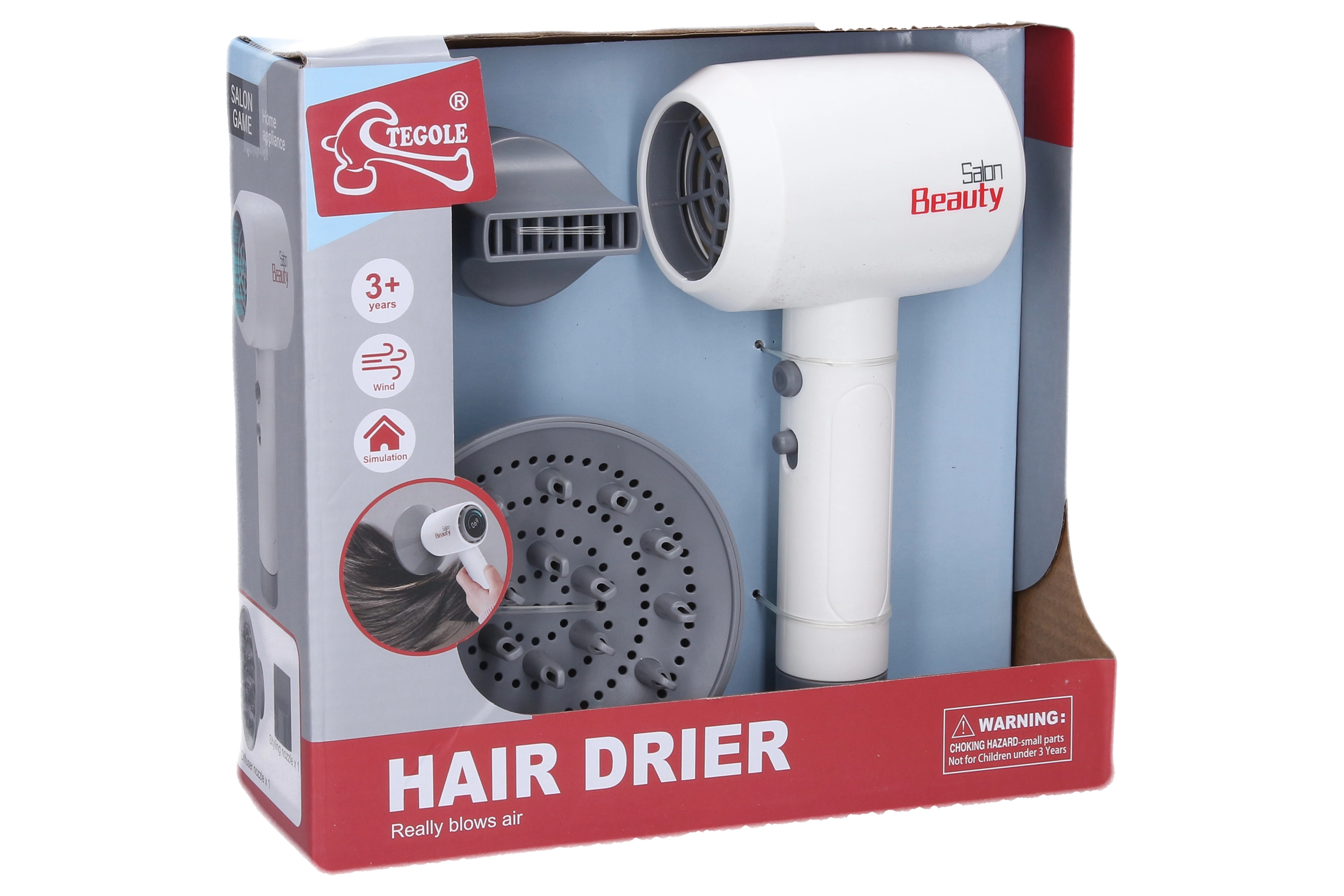 Hračka je navrhnutá na bezpečnú domácu zábavu – obsahuje tlačidlo on/off a jedno dekoratívne tlačidlo bez funkcie. Fén je napájaný z 1× AA batérie (nie je súčasťou balenia), takže ho možno ľahko vziať kamkoľvek.