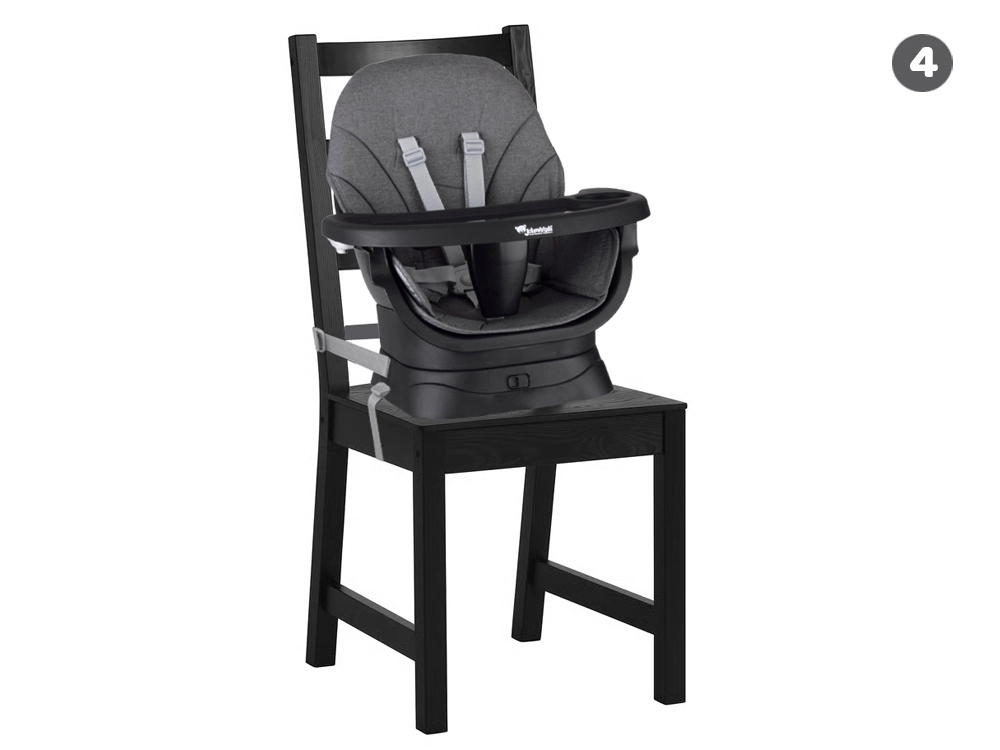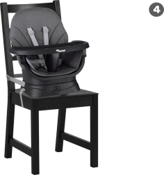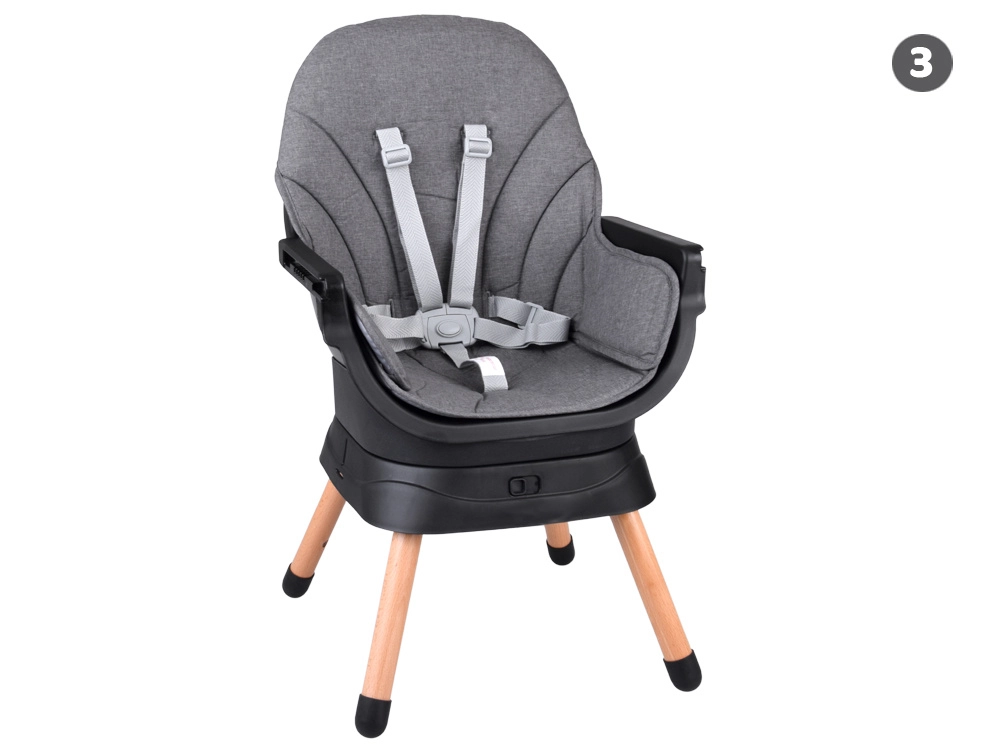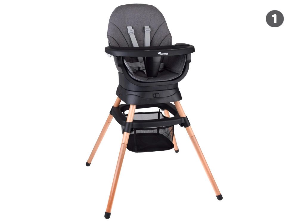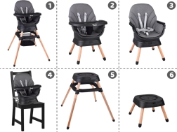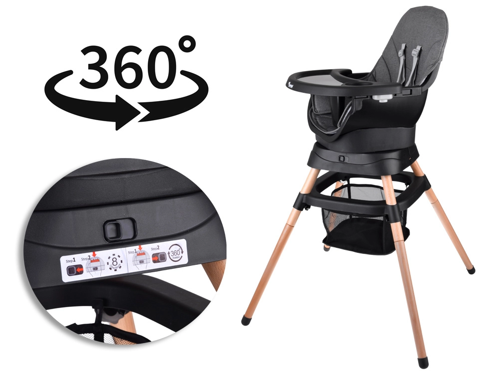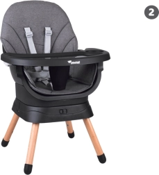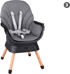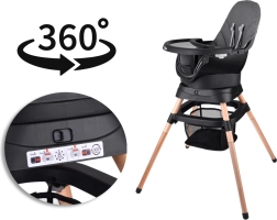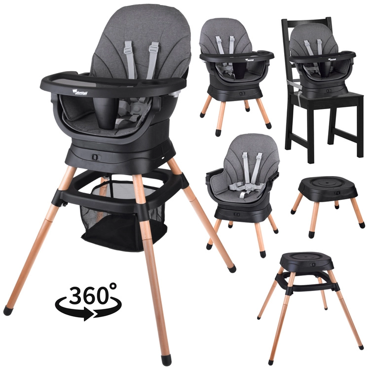 Multifunkčná stolička 6v1 kombinuje pohodlie, bezpečnosť a praktickosť v jednom riešení. Vďaka premyslenej modulárnej konštrukcii ju ľahko premeníte na vysokú jedálenskú stoličku, nízku stoličku s pultíkom, samostatné kresielko, nadstavec na jedálenskú stoličku, vysoký taburet či nízky stolček. Otočné sedadlo o 360° s 8 polohami aretácie zaistí ideálne nastavenie na kŕmenie aj hranie.