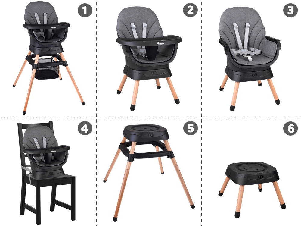 - 6 funkcií v jednom – stolička, nízka stolička, kresielko, nadstavec na stoličku, vysoký taburet, nízky stolček.