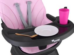 Modulárny systém umožní rýchlu prestavbu bez náradia: vysoká jedálenská stolička, nízka stolička s táckou, samostatné kresielko, nástavec na jedálenskú stoličku so zapínacími pásmi, vysoký taburet aj nízky stoliček. Priestor pod stoličkou dopĺňa praktický košík na drobnosti.