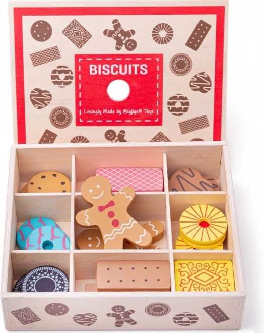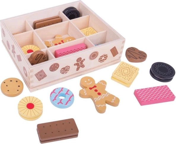 Predstavujeme drevenú krabičku s hračkami sušienok, ktorá obsahuje sortiment obľúbených sušienok, vrátane perníčkov a ďalších lahôdok. Táto sada umožňuje malým deťom rozvíjať svoju kreativitu prostredníctvom hry inšpirovanej pečením.