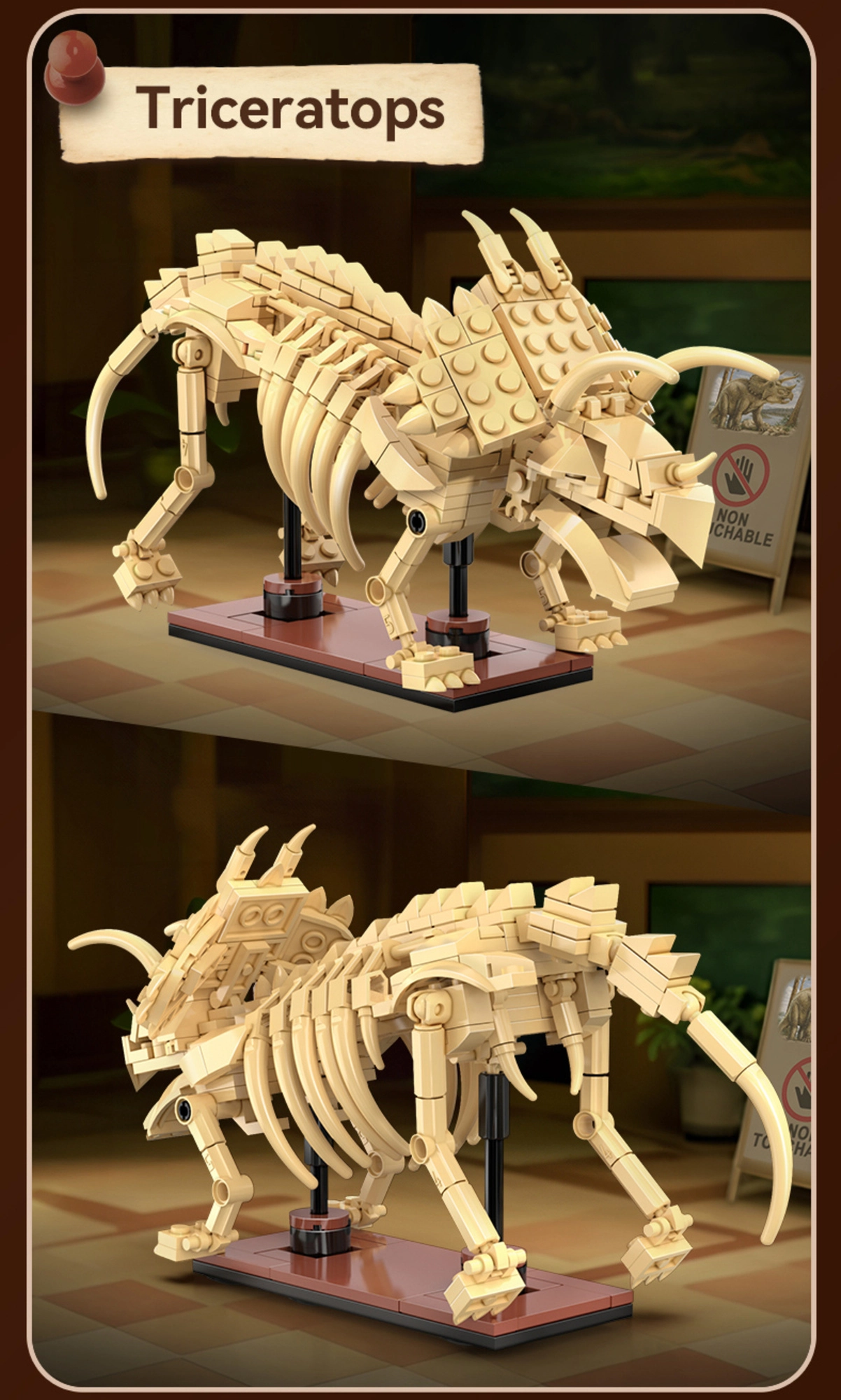 Vďaka pohyblivým kĺbom krku, končatín a chvosta ľahko meníte pózy. Modulárna konštrukcia umožňuje spojenie s ďalšími setmi zo série a rozšírenie zbierky. Všetko sa skladá intuitívne – bez lepidla a náradia, s pevnými spojmi kompatibilnými s inými stavebnicami.