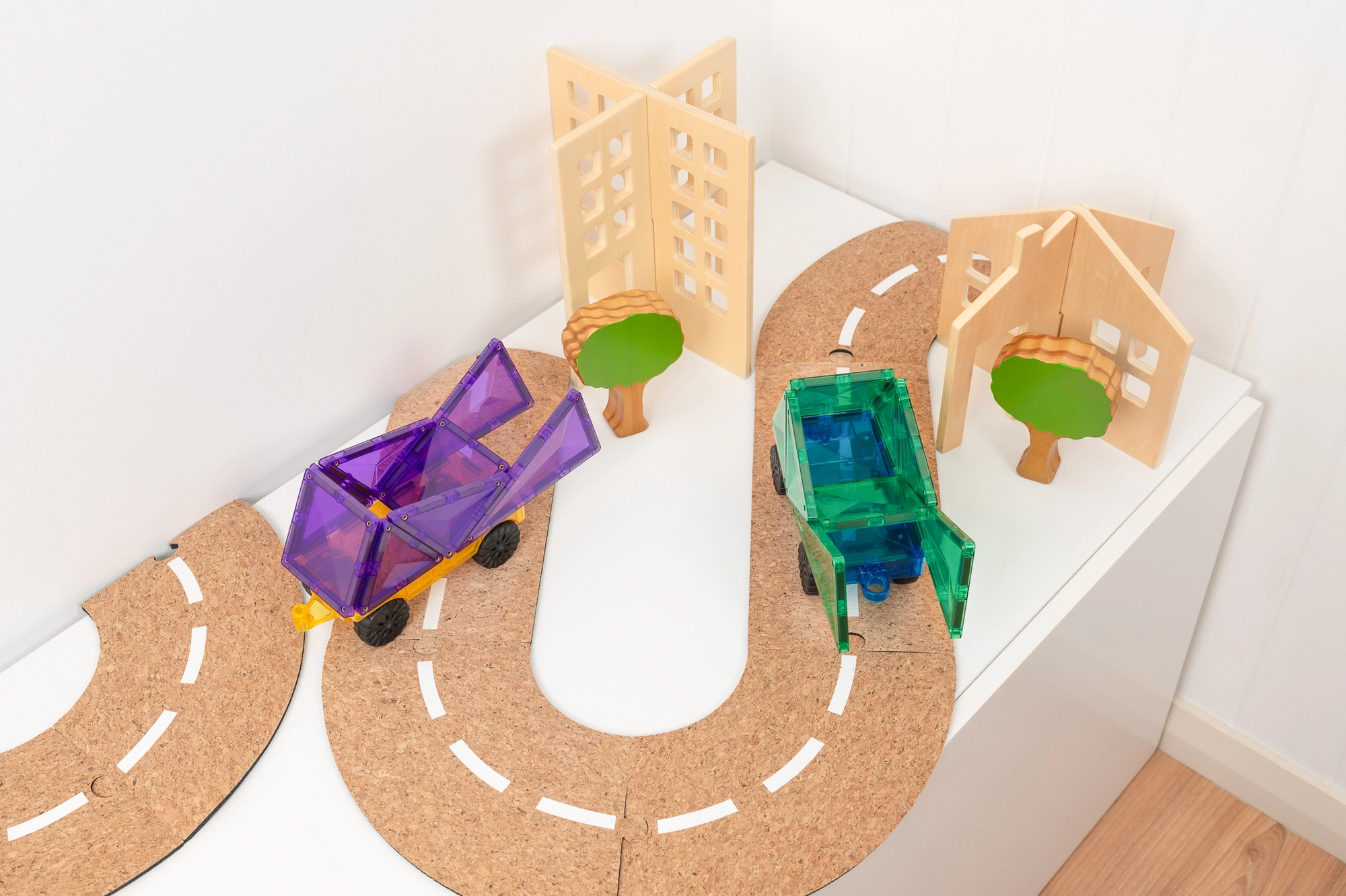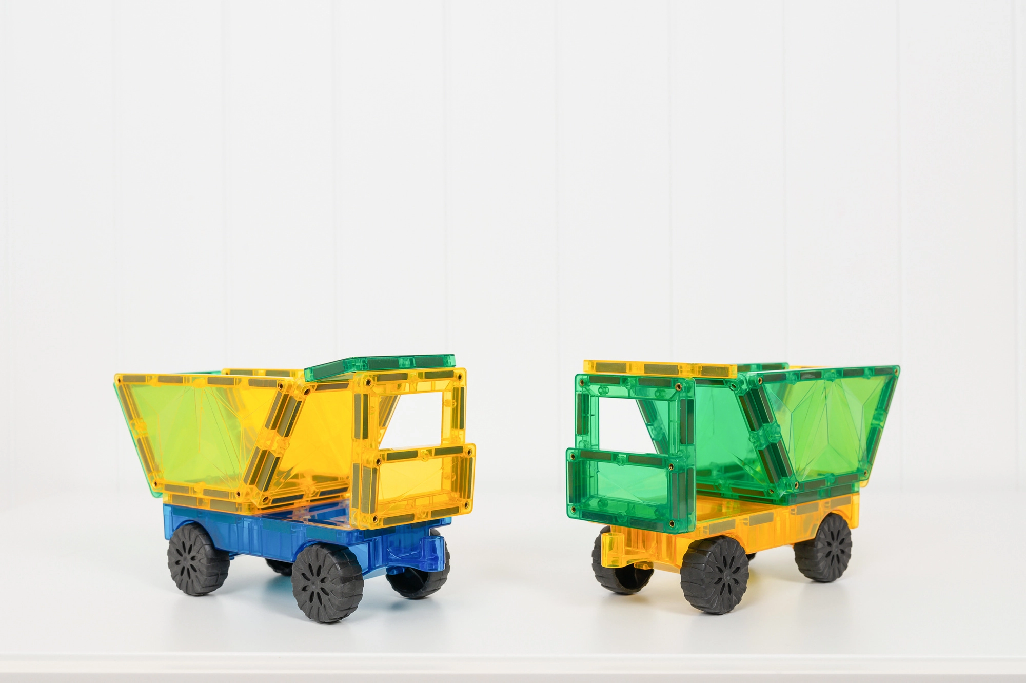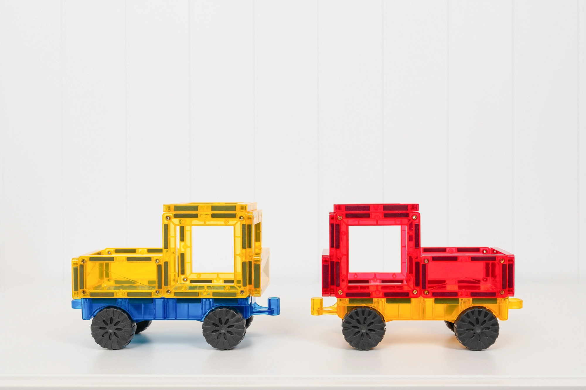 Dva priehľadné podvozky s hladkým chodom kolies a očkami na jednoduché spájanie. Postavte autá, ťahače alebo vláčiky a pustite sa do hry na cestách.