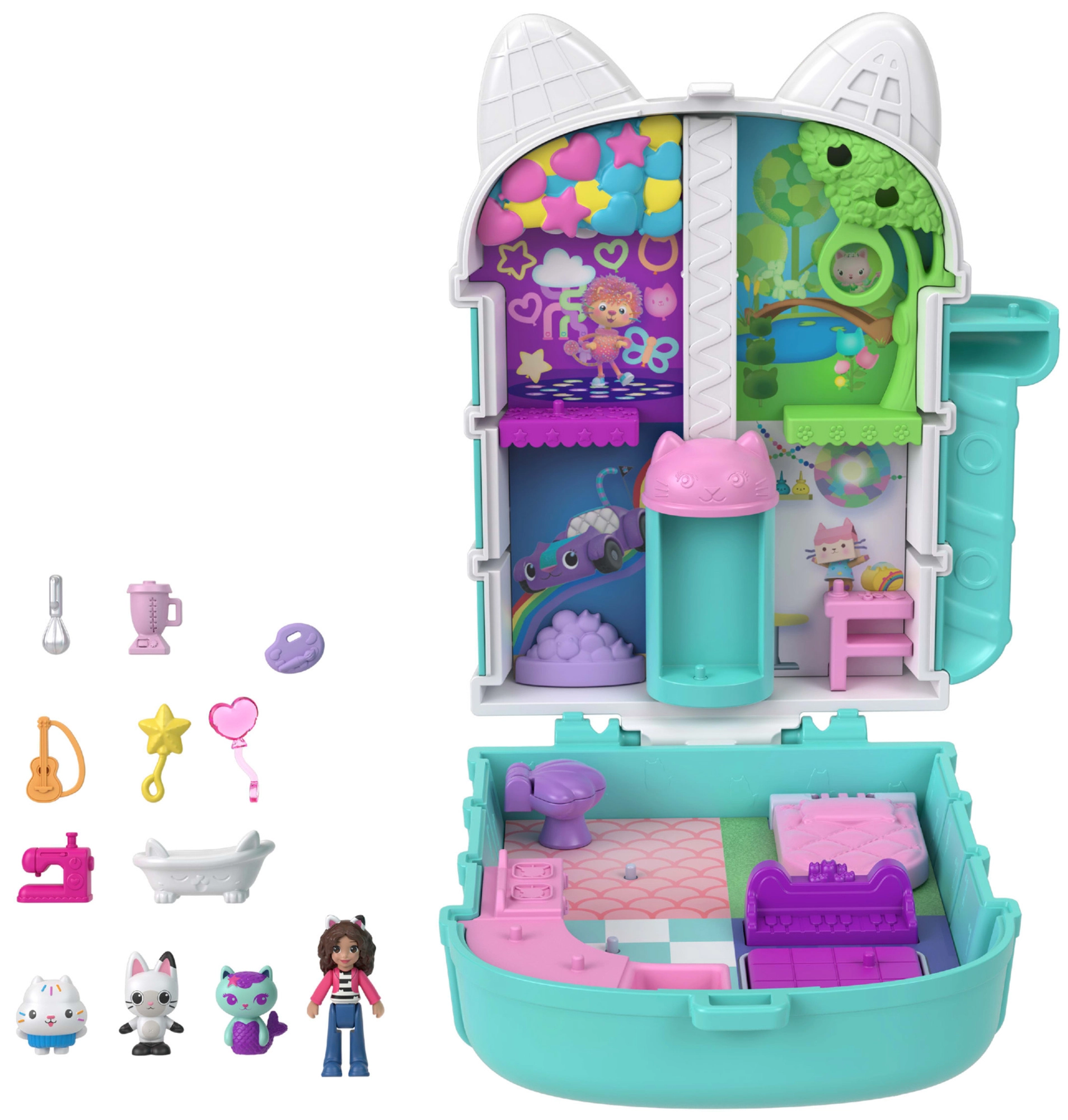 Súčasťou je mikrobábika Gabi a rozkošné mačacie postavičky, nábytok aj funkčné doplnky ako mačací výťah, výklopné bannery, miniatúrna kúpeľňa a ďalšie vychytávky, ktoré podporujú kreatívnu hru a rozvoj jemnej motoriky.