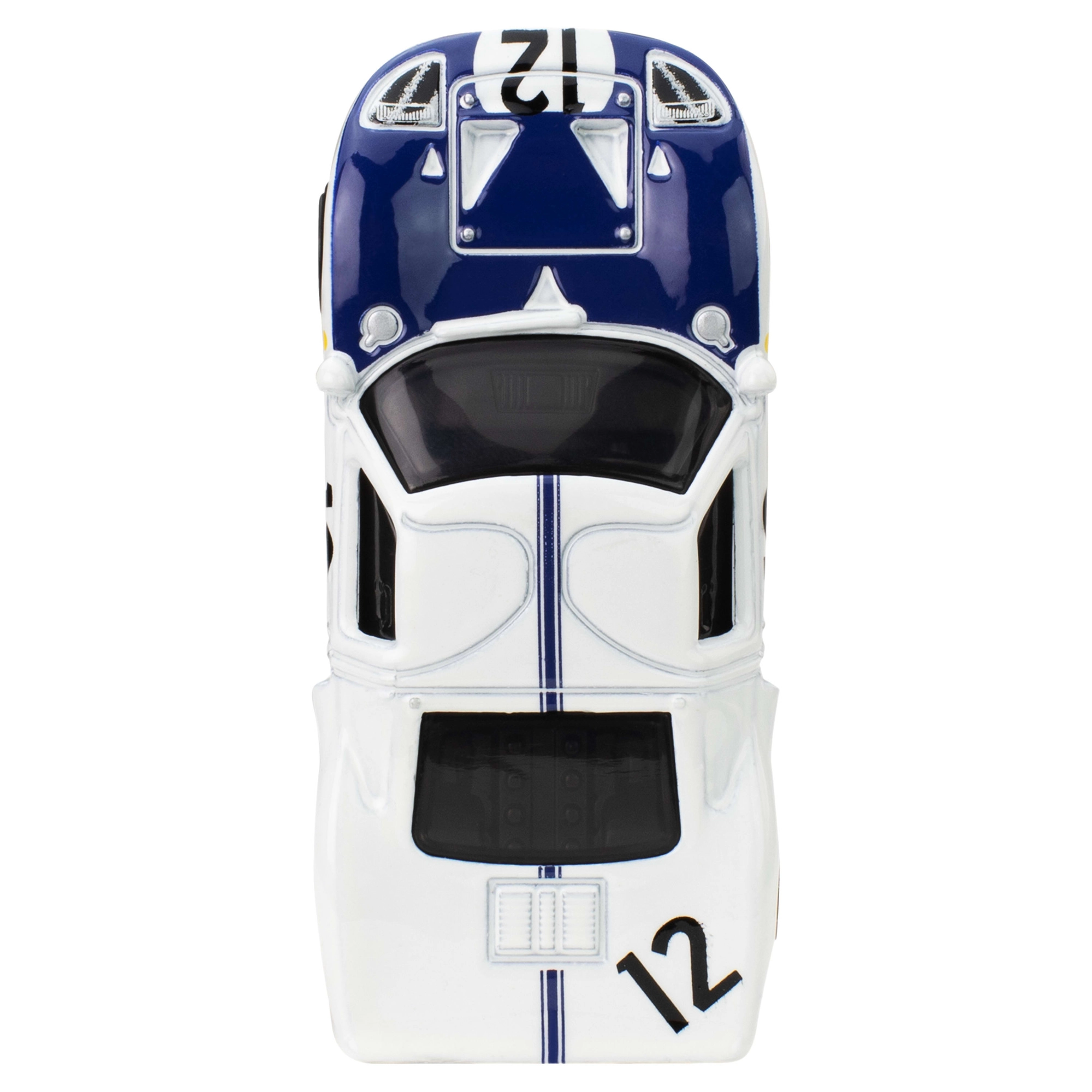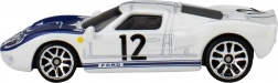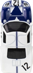 Biela karoséria s modrými pruhmi, číslom 12 a realistickými detailmi zvýrazňuje ikonický vzhľad vozidla FORD GT40.